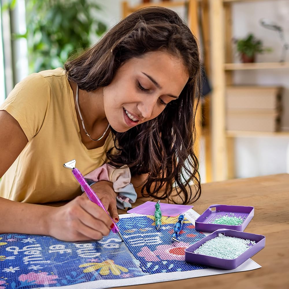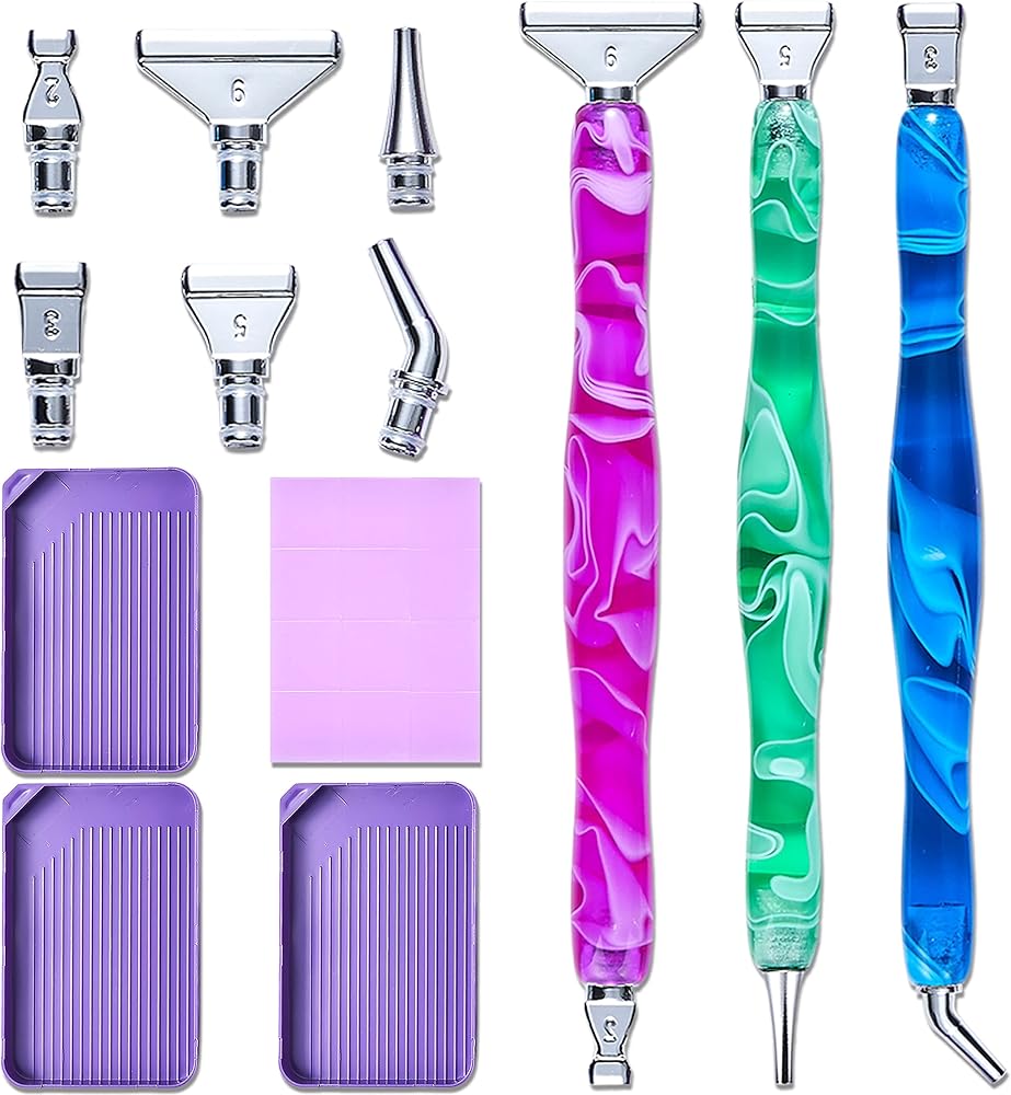 💜【Meet All Your Needs】3pcs pretty diamond painting pen, 6pcs metal diamond painting tips, 12pcs glue clay, 3 diamond painting trays. Variety of tips to meet your diverse needs, faster and more durable than plastic tips, makes your point drill more eye-catching and exceptional.