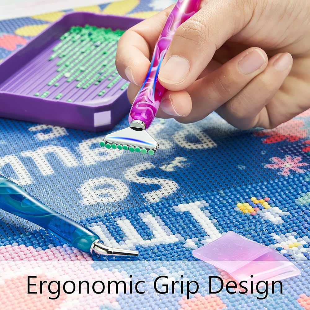 💜【Upgrade Diamond Pens Kit】Pretty diamond art pens are made of premium resin. Metal tips equipped with rubber rings, which will not loosen easily, simply install or replace, no glue needed, you only need to screw it in and out.