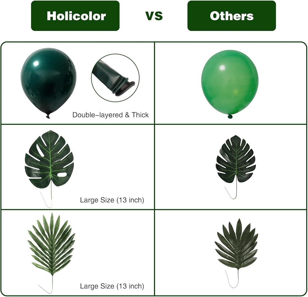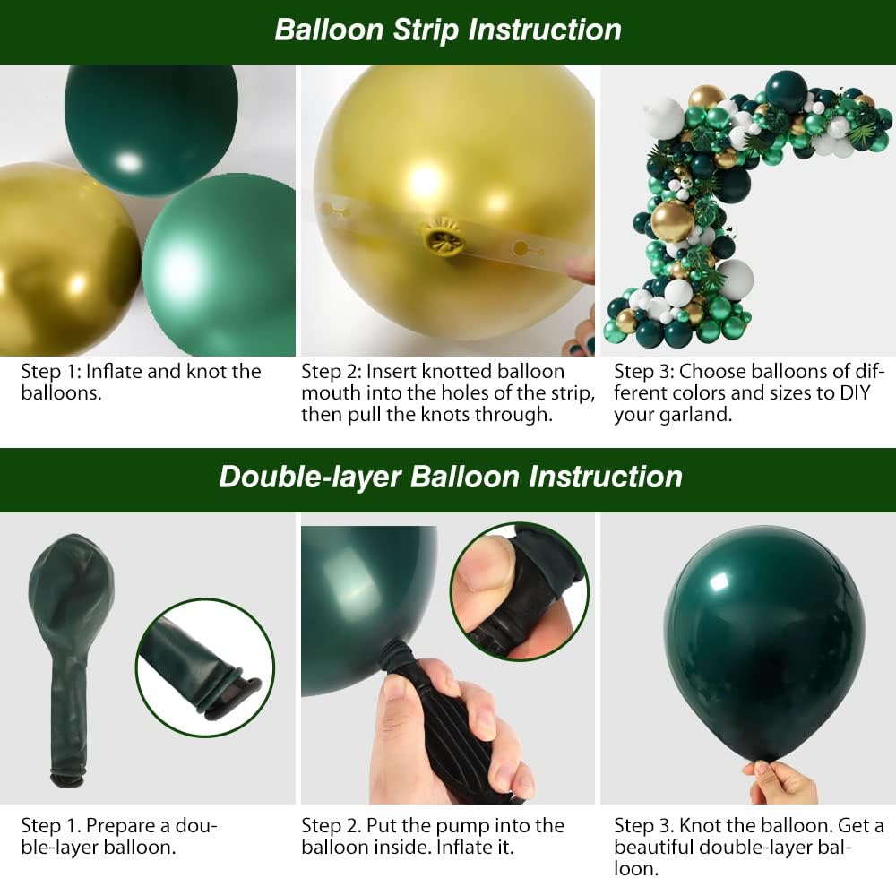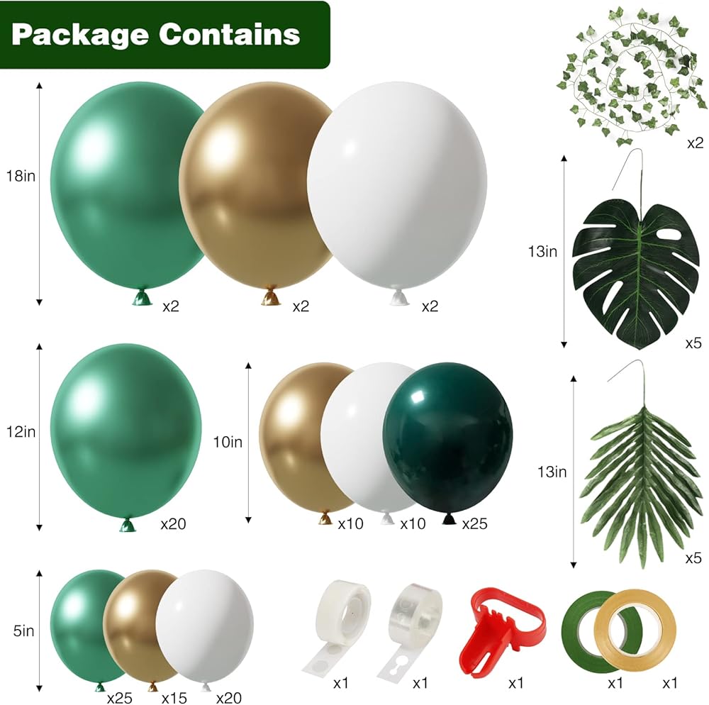 ALL-IN-ONE Package: This jungle balloon arch kit contains metallic green balloons (25pcs 5”, 20pcs 12” and 2pcs 18”), metallic gold balloons (15pcs 5”, 10pcs 10” and 2pcs 18”), white balloons (20pcs 5”, 10pcs 10” and 2pcs 18”), double-layers dark green balloons (25pcs 10”), 5pcs monstera leaves, 5pcs palm leaves, 2pcs creepers, 2pcs ribbons, 1pc dot glue, 1pc balloon strip and 1 knotter.