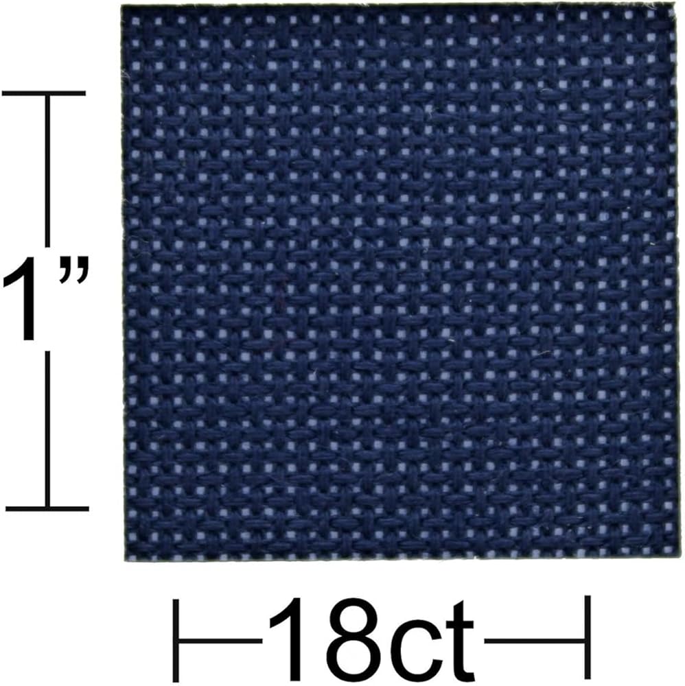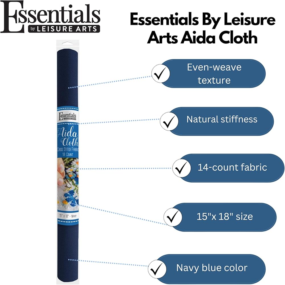 Essentials By Leisure Arts Aida Cloth is an open, even-weave fabric traditionally used for counted cross stitch, embroidery, needlepoint and machine embroidery. This cotton mesh fabric has a natural stiffness to allow cross stitch and embroidery without a hoop. Great for any DIY needle craft projects, such as tablecloths, curtains, cushions, pillows, sofas, decorative cloths and more. Folds and wrinkles are easily smoothed or ironed out at low heat. Suitable for an skill level from novice to expert. Rolled packaging keeps the fabric free of folds and creases. After stitching, hand wash in lukewarm water with a mild liquid soap. Rinse in cold water. Let dry flat. Aida fabric has a precise square-patterned weave with visible stitching holes that makes this fabric easy to use and allows your needle to easily glide through the holes. Each piece measures 15-inch length by 18-inch width and is Navy. This 18 count fabric contains 18 holes per inch making designs more intricate and realistic.