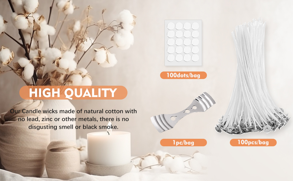 HIGH QUALITY: Our candle wicks made of natural cotton with no lead, zinc or other metals, there is no disgusting smell or black smoke. Wicks with coated in soy wax. Suitable for soy, beeswax, palm, coconut, paraffin, etc.