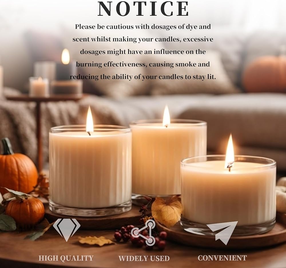 TIPS: Please be cautious with dosages of dye and scent whilst making your candles, excessive dosages might have an influence on the burning effectiveness, causing smoke and reducing the ability of your candles to stay lit.