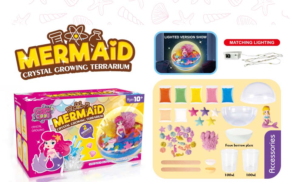 🧜♀️Everything You Need is Included : Our crystal growing kit comes with everything you need, including 2 seed crystals, 7 bags of decorative sand, 1 bag of decorative rocks, 1 mermaid, 1 growing chamber, 1 base, 2 stirrer, 2 beakers, and 1 USB lights.