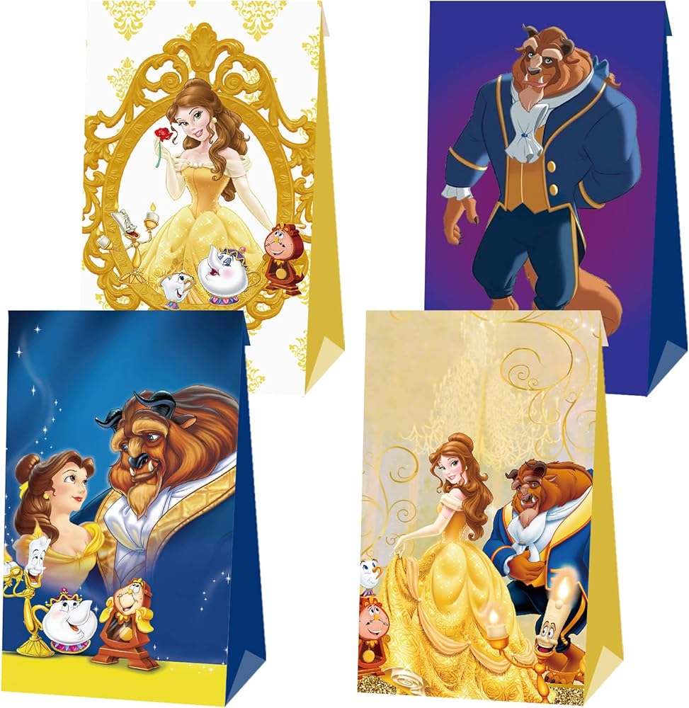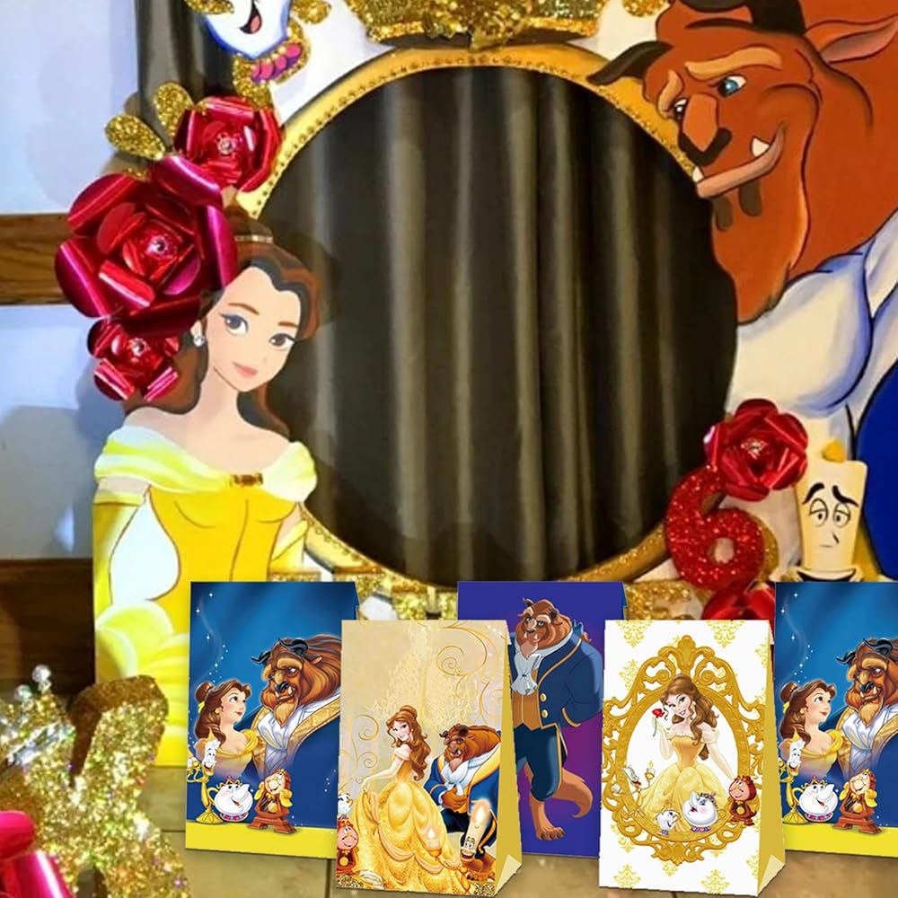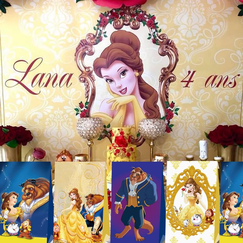 16 قطعة من حقائب حفلات الجمال والوحش، حقيبة هدايا لحفلات الأميرة بيل من لوازم حفلات الجمال والوحش، حقائب هدايا مطبوعة على الوجهين، حقائب حلوى لتزيين حفلات عيد الميلاد الجميلة والوحش