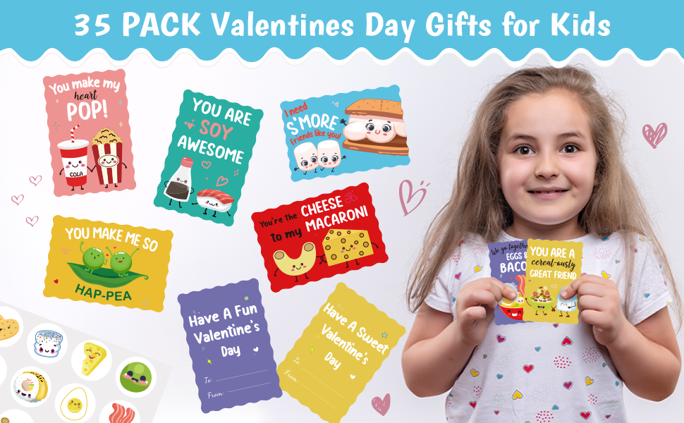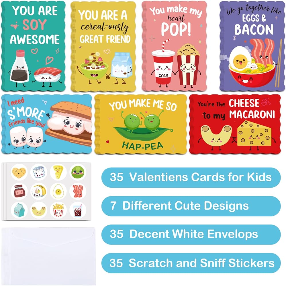 Valentines Cards for Kids Classroom -- Comes in a compact gift box, which contains 35 cute valentine cards, 35 scratch & sniff stickers and 35 decent-sized envelopes. They are adorable and gender neutral valentines cards which is perfect for most kindergarten, primary school students.