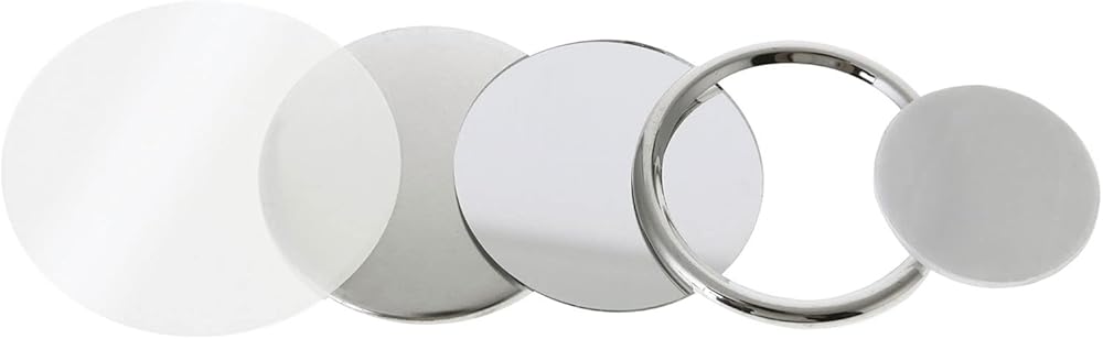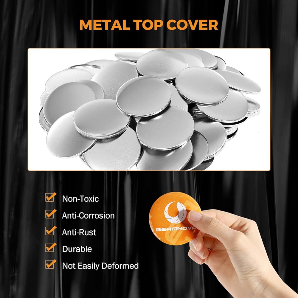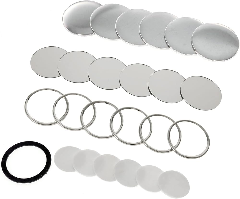 COMPLETE SET - Each set includes 1 * tinplate pin top cover, 1 * mirror bottom, 1 * circle, a piece of plastic film, and a fixing sponge sheet. With this set, you can create 100 pocket mirrors. Comes with a rubber ring. NOTE: The mirror supplies must be used with a machine. The machine is not included.