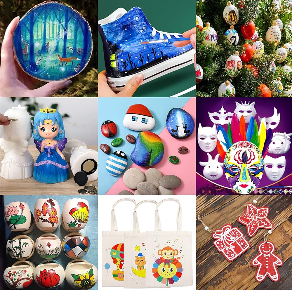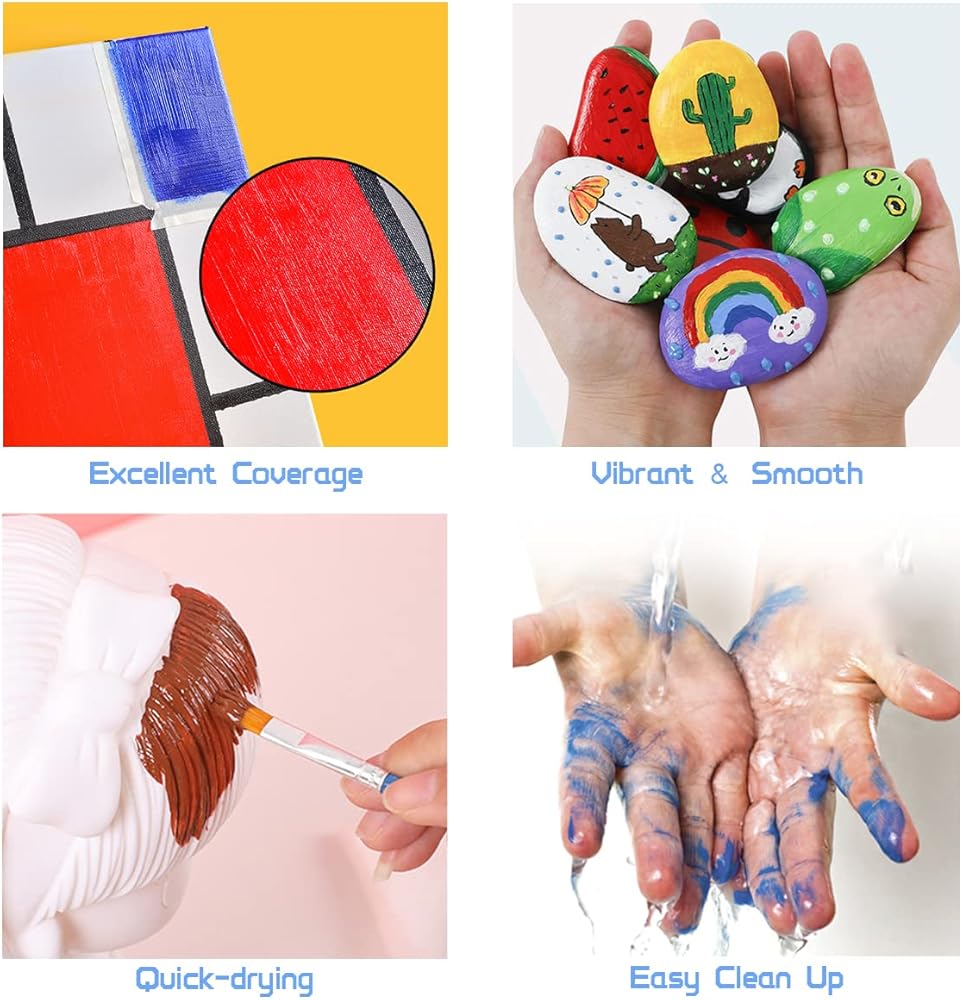 Excellent coverage, Rich pigment, Non Fading, High Quality, Perfect for kids, art teachers, at-home craft supplies, painting lovers and kid's paint party favors. Easy clean up, Quick-drying, Can be applied to a wide range of surfaces.