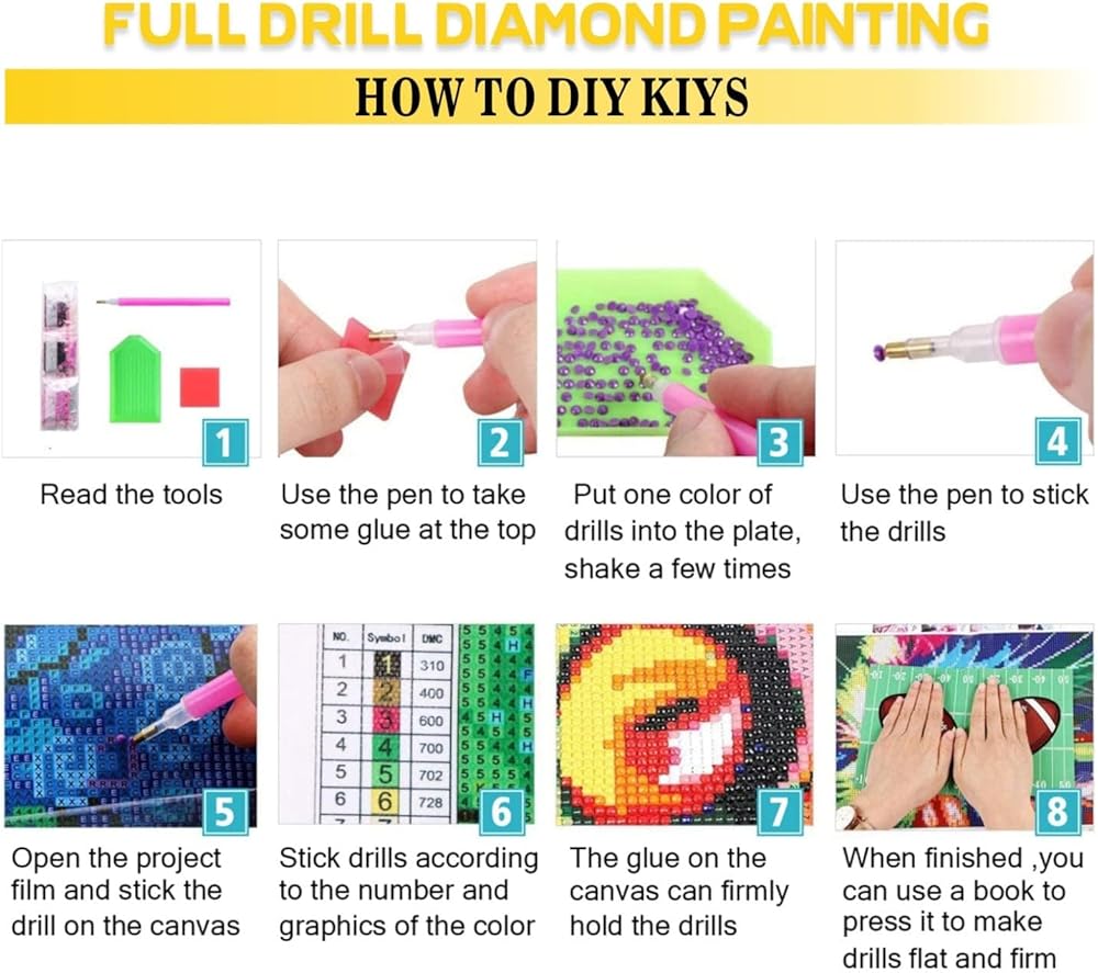 WHAT YOU WILL GET: Each diamond painting kit comes with everything you need to get started! I premium full-drill adhesive canvas with printed legend, 5D round diamond drills in labeled packaging, 1 diamond applicator pen, 1 wax to pick up diamonds using an applicator pen, and 1 tray for holding diamonds.