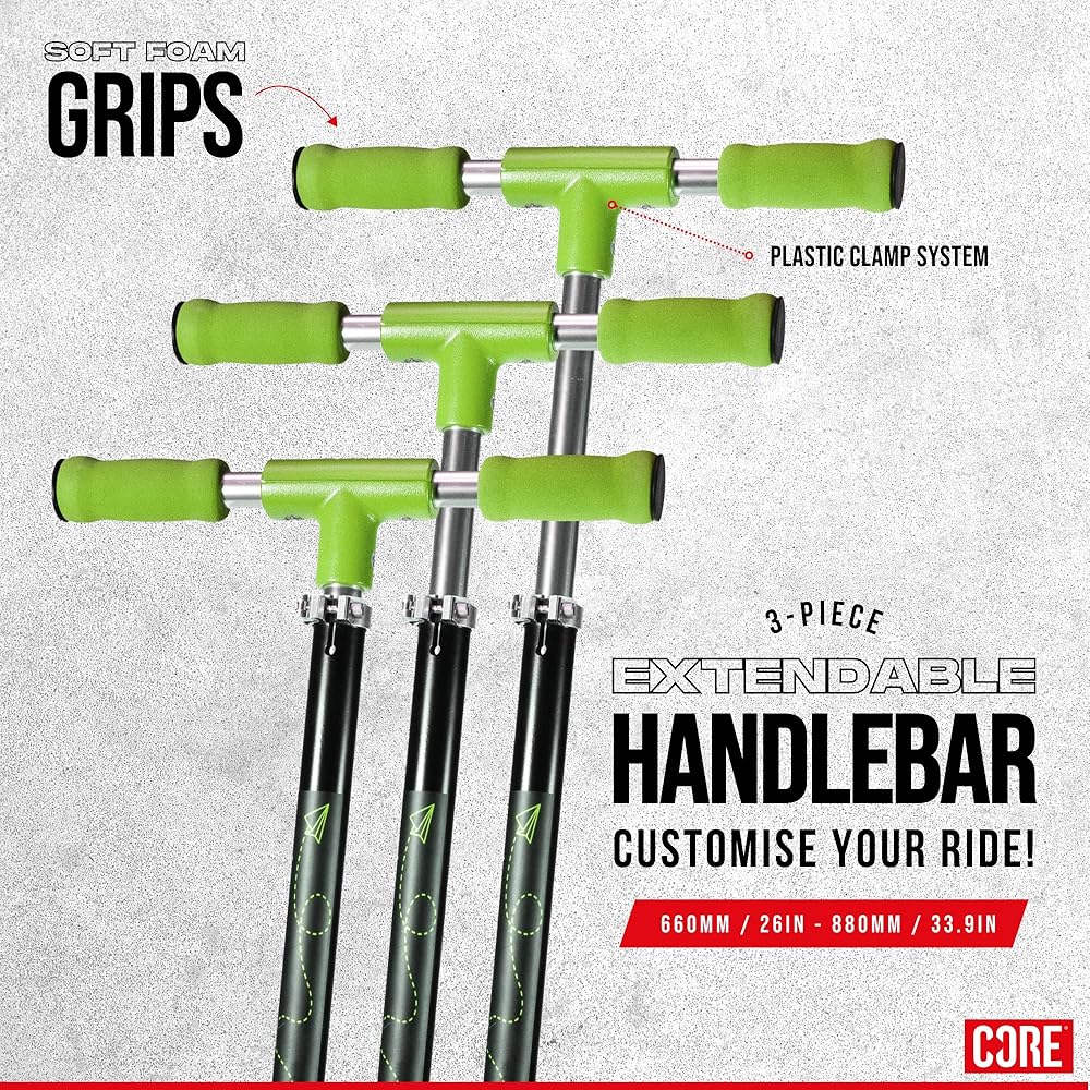 • ADJUSTABLE HANDLEBARS; The CORE FOLDY Kids Scooter comes with Adjustable handlebars that allow your child to find the most comfortable and secure grip, ensuring a safe and enjoyable ride. The Kids foldable handlebars can be easily adjusted to the perfect height for your child, making it suitable for kids of different ages and sizes.