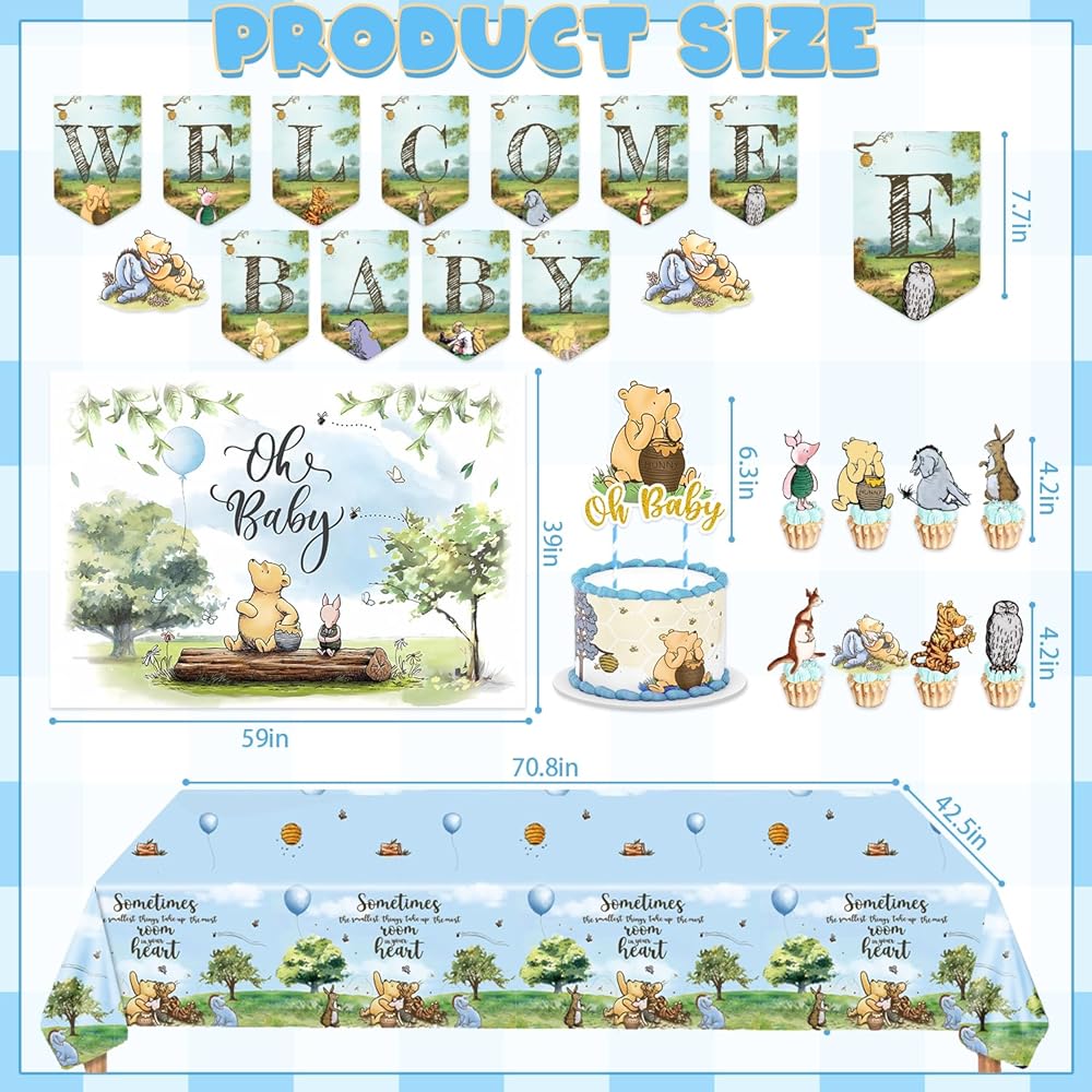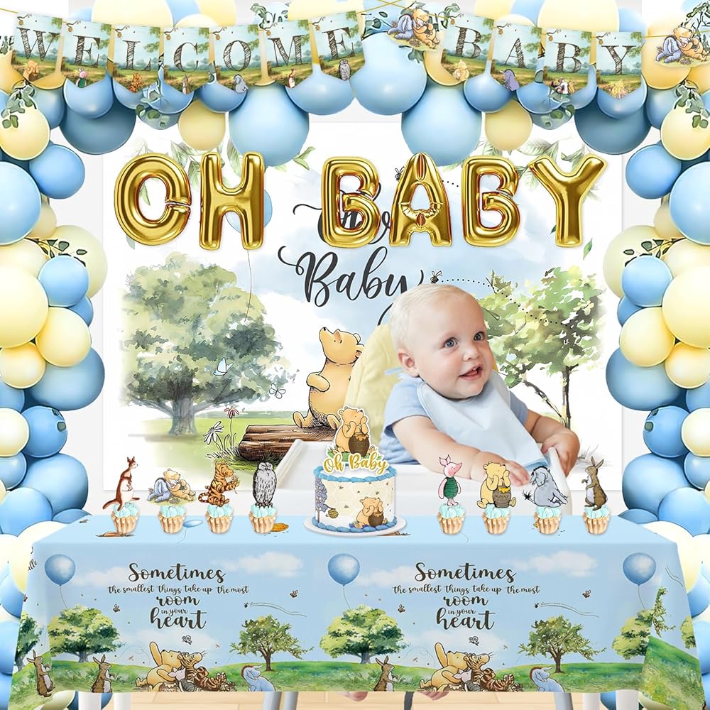 • package includes: 90 pcs latex balloons include 30pcs 12" balloons, 30pcs 10in balloons, 30pcs 5in balloons, 1pcs pre-strung welcome baby banner, 1 pc 59" x 39" classic the pooh backdrop, 1 pc tablecloth(70.8"*42.5")1 set OH BABY foil balloon, 1 cake topper and 16 cupcake toppers. in addition, 2 rolls of glue, one balloon chain, and one coil are also included as gifts. this set can enrich the decoration of your baby shower party and add attractiveness to the party