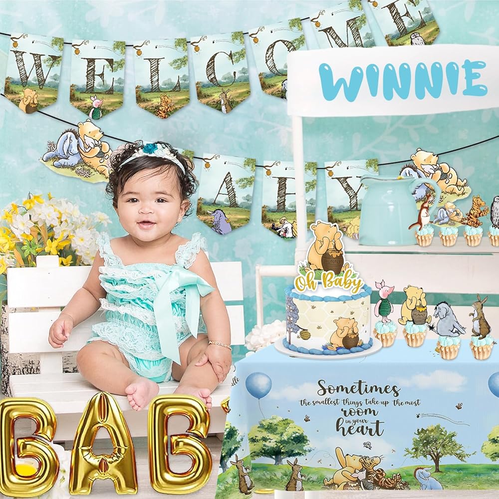 • classic winnie baby shower decorations: the set provides a cohesive theme for your baby shower, featuring the beloved classic winnie characters. classic the pooh is an iconic and timeless character loved by many. using this theme adds a touch of nostalgia and charm to your baby shower, creating a warm and welcoming atmosphere that both children and adults can enjoy