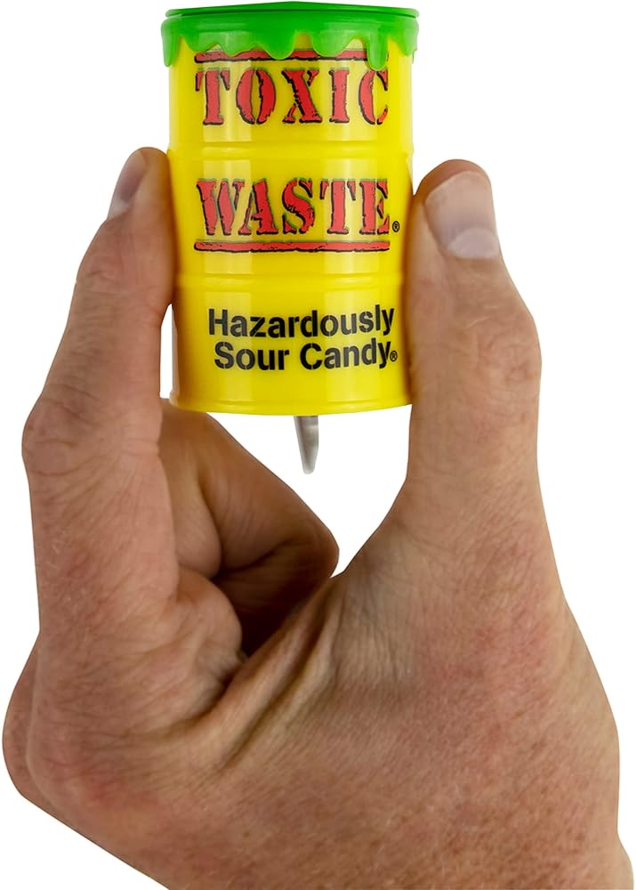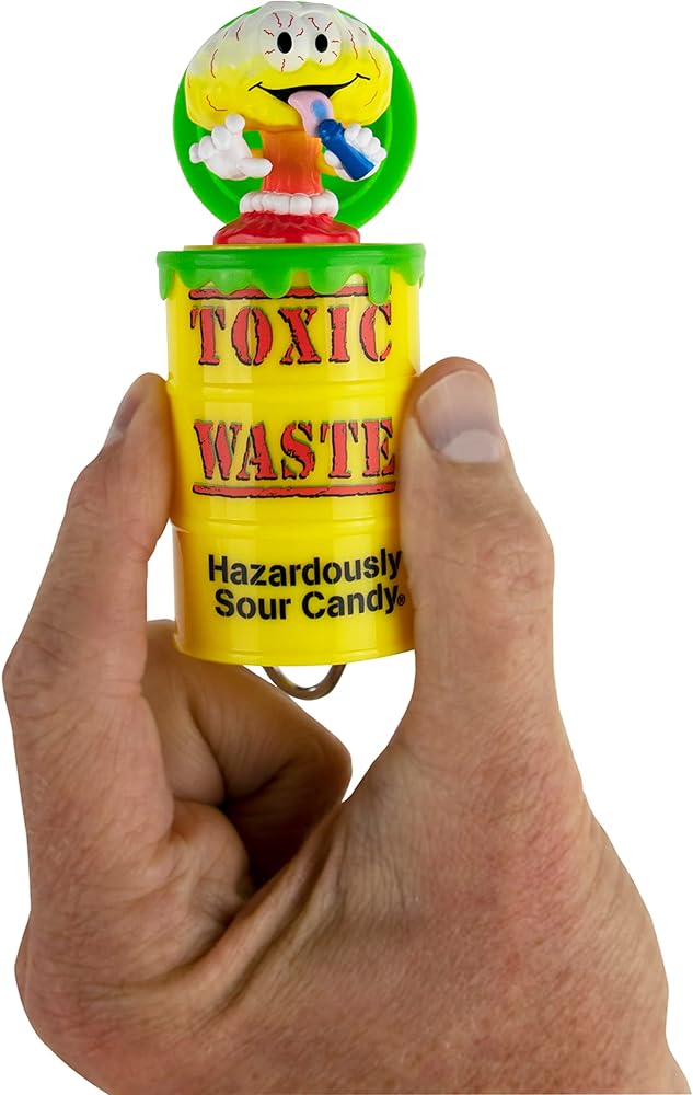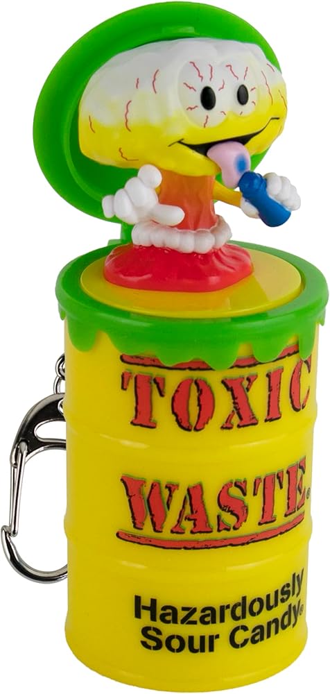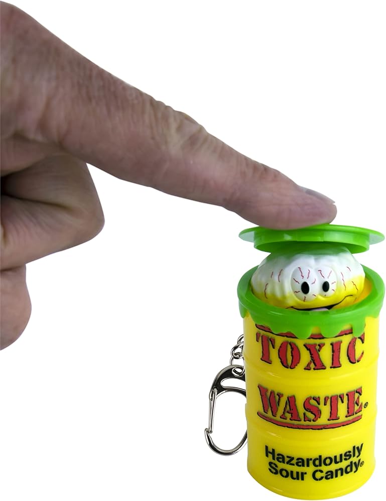 Introducing the #1 Candy Brand pop up figure keychain! Simply squeeze the sides of the Toxic Waste drum and Mr. Toxie pops up! Close the lid and he will disappear! Clip the keychain to your backpack for take everywhere fun! This is sure to brings smiles to kids of all ages!