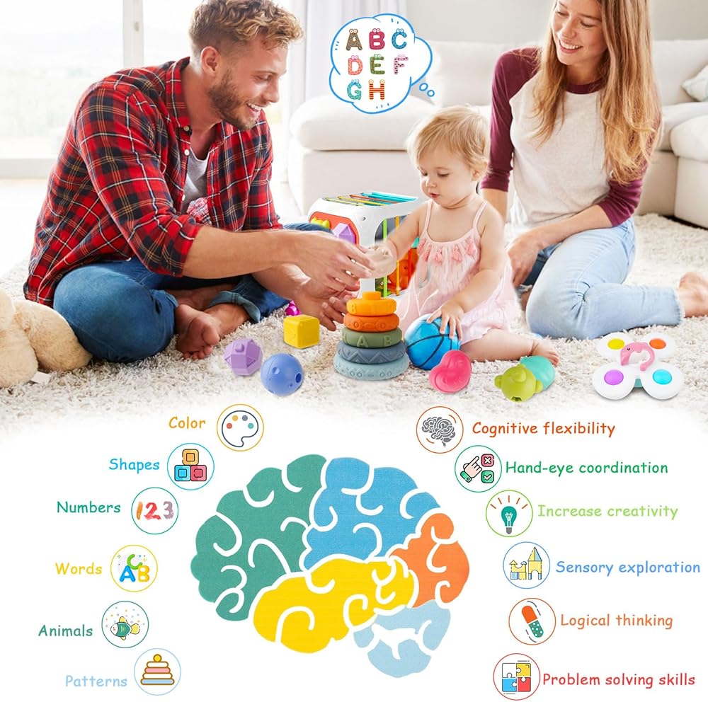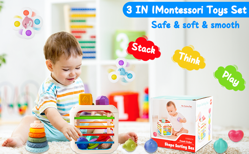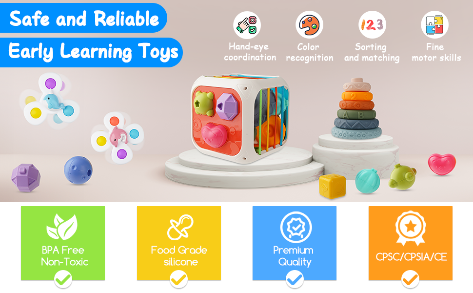 【100% Safe Baby Toys】Supkiz baby Montessori toys are made of high-quality ABS plastic and durable food-grade silicone, BPA Free, Phthalate Free, Non-toxic, and easy to clean. Our Infant Toys have passed the CPC/ASTM certification tests to ensure that every detail is safe for baby. The 3-in-1 toddlers toys set include 6 soft stacking rings, 2 suction cup spinning bath toys, a explore sensory cube bin with elastic bands and 5 blocks. Early educational sensory toys for babies 6 to 12 months.