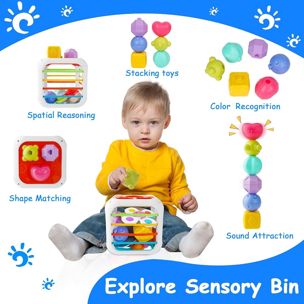 【Explore Shape Sorter Cube】The baby toy set Includes a cube with colored elastic bands, 6 blocks in different colors, textures, and shapes. Shaking makes a crisp rattling sound to attract child's attention and stimulate their senses. Baby can train their grasping power by putting the blocks in or out of the cube, enhancing their sense of space, awakening their curiosity and helping them experiment. Our explore sensory bin is great for baby learning colors and developing their fine motor skills.
