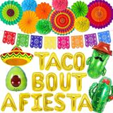 TACO BOUT A BABY Decorations: Contains 13pcs 16in"TACO BOUT A BABY"letter aluminum film balloons, 1pcs taco foil balloon, 1pcs cactus mother, 1pcs cactus father, and 1pcs avocado baby foil balloon. 6pcs colorful paper fans, 1pcs classic fiesta banner and 1pcs triangle banner. Taco bout a baby shower decorations meets all your needs for fiesta baby shower decorations.