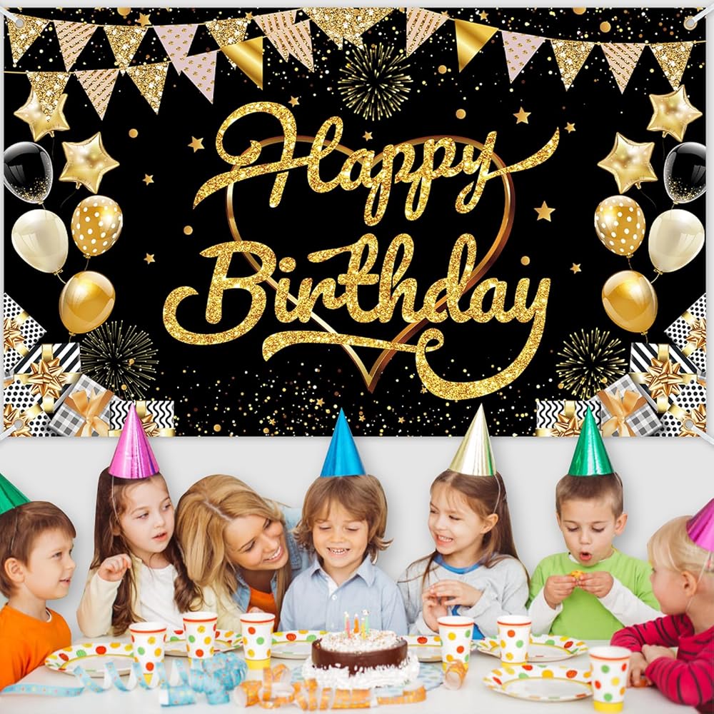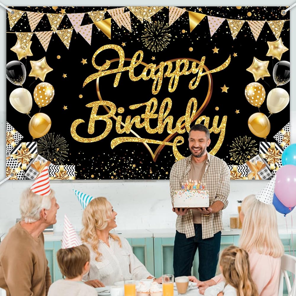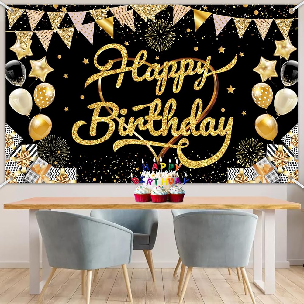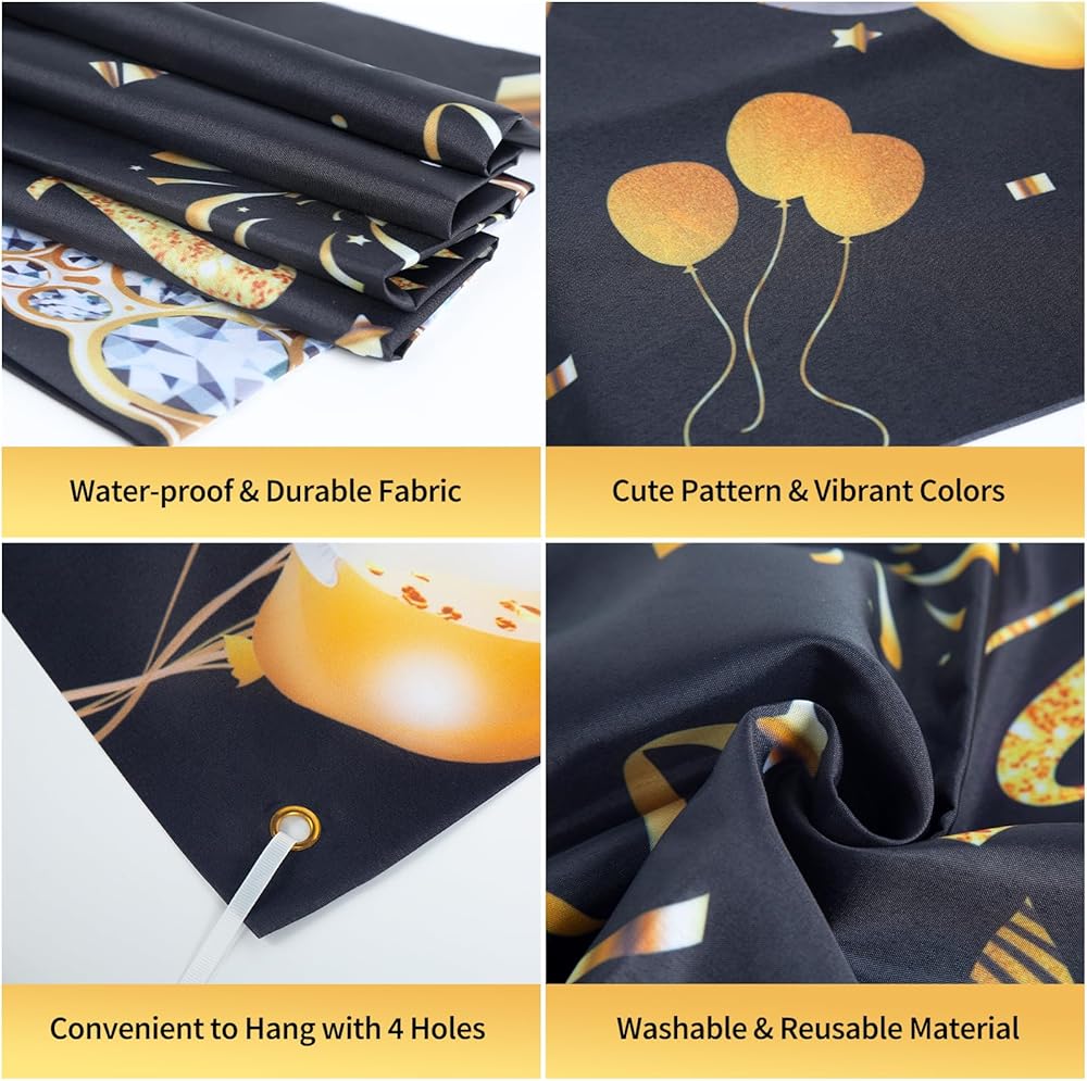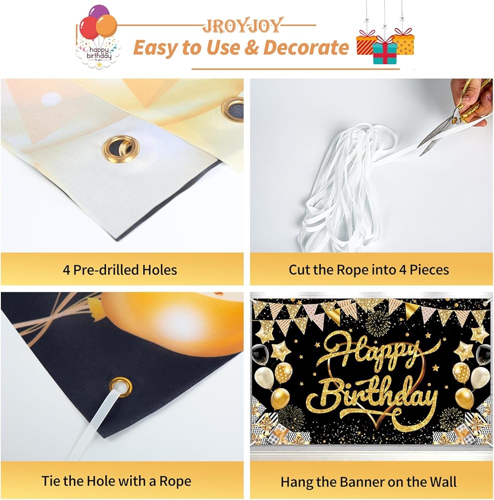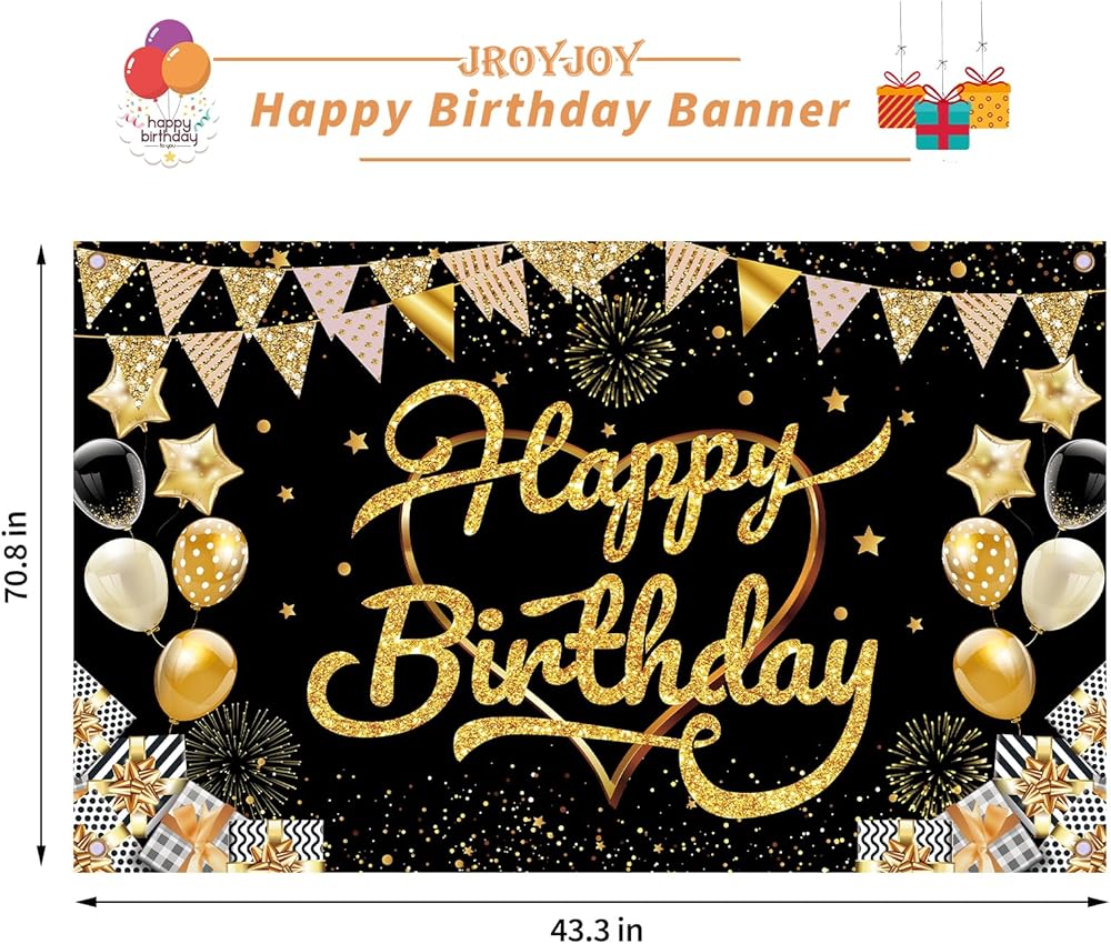 【ما تحصل عليه】تأتي العبوة مع قطعة واحدة من لافتة عيد الميلاد باللونين الأسود والذهبي وشريط بطول 6 أمتار يمكن ربط علم عيد ميلاد JroyJoy من خلال الفتحات. يمكن لخلفية عيد ميلاد سعيد JroyJoy للفتيات والأولاد أن تجلب جوًا مبهجًا ومدهشًا وحيويًا لحفلة عيد ميلادك وتمنحك ولعائلتك وأصدقائك ذكرى رائعة لا تُنسى. أتمنى لكم السعادة كل يوم!
