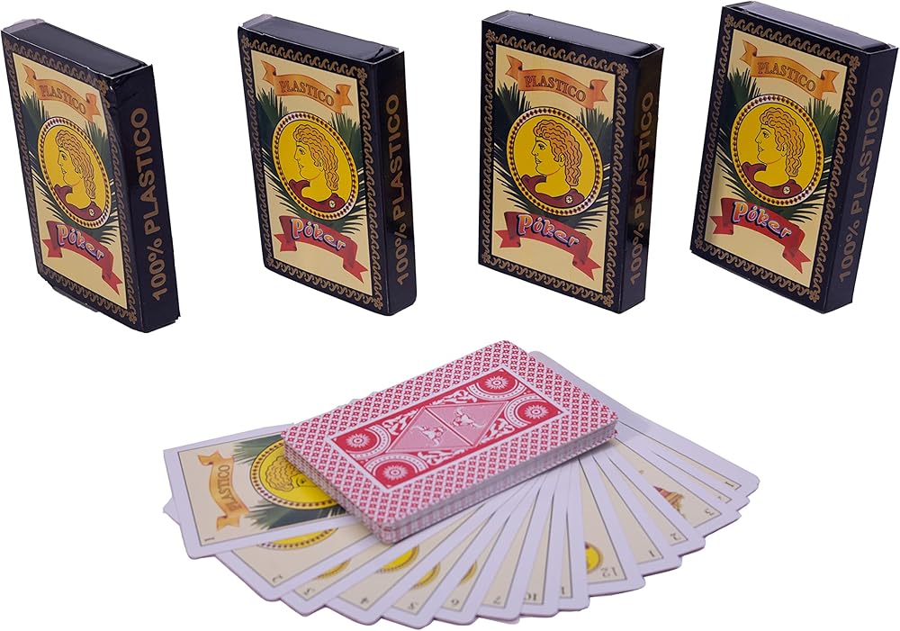 The Spanish playing card is about 2.4 x 3.7 inch/ 6.2 x 9.5 cm, the thickness is only 0.3MM. 4 decks of poker cards included.
