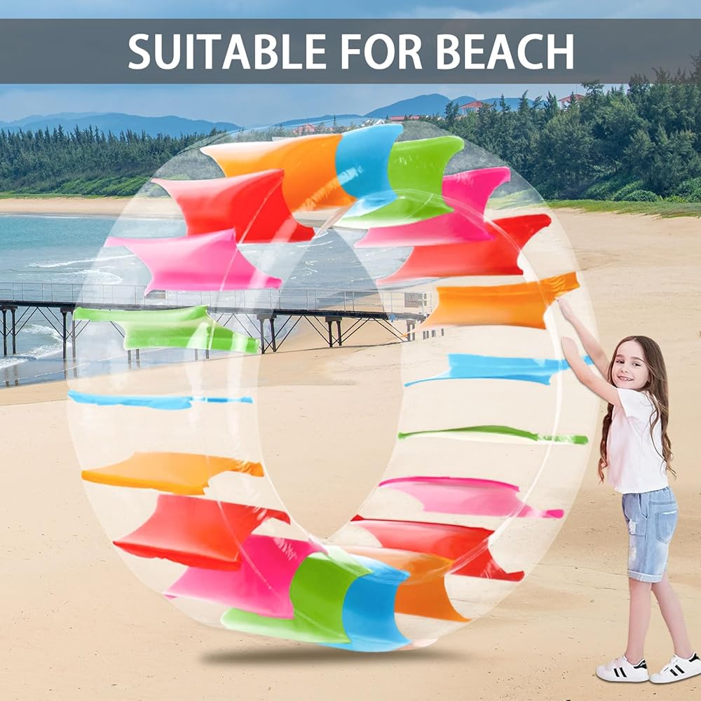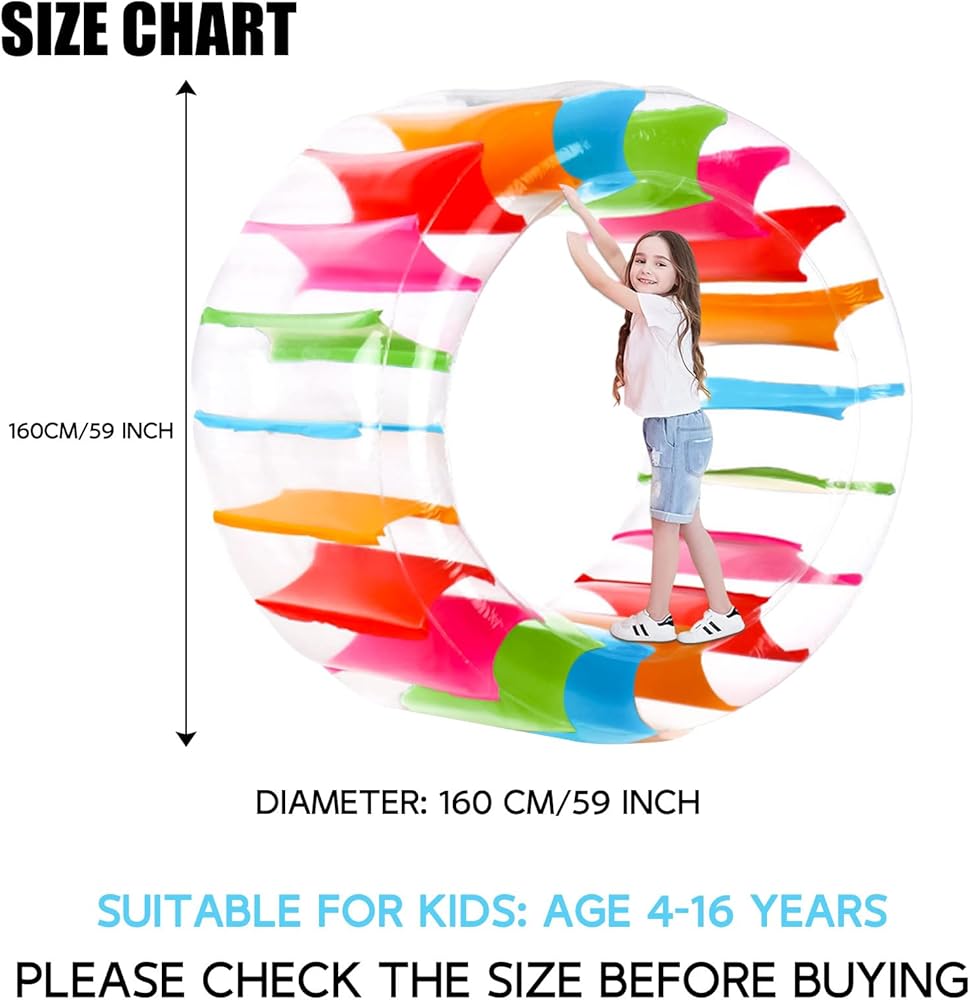 【PREMIUM DURABLE & SAFE MATERIAL】 To meet more customers' needs, we have updated the 2023 Latest Large Size (Largest in the market): For Kids 4 - 16 Years. 65'' diameter, 52'' inner diameter, 32'' width, 7.9'' thickness. Our kids inflatable water wheel roller is made of latest industrial grade PVC material, which is durable, soft, safe and odorless. Besides, our colorful pool Inflatable float is easy to use and store, you can fold this fun floaties after it is dry.