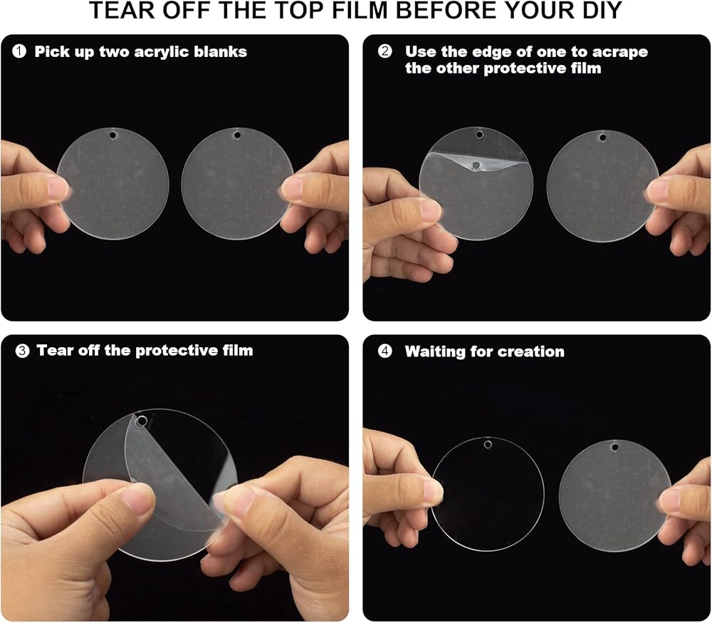 Please note: All acrylic discs are covered with protective film on both sides that should be peeled off before use. This protective layer keeps the acrylic blank from being scratched or getting dirty.