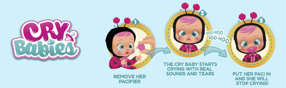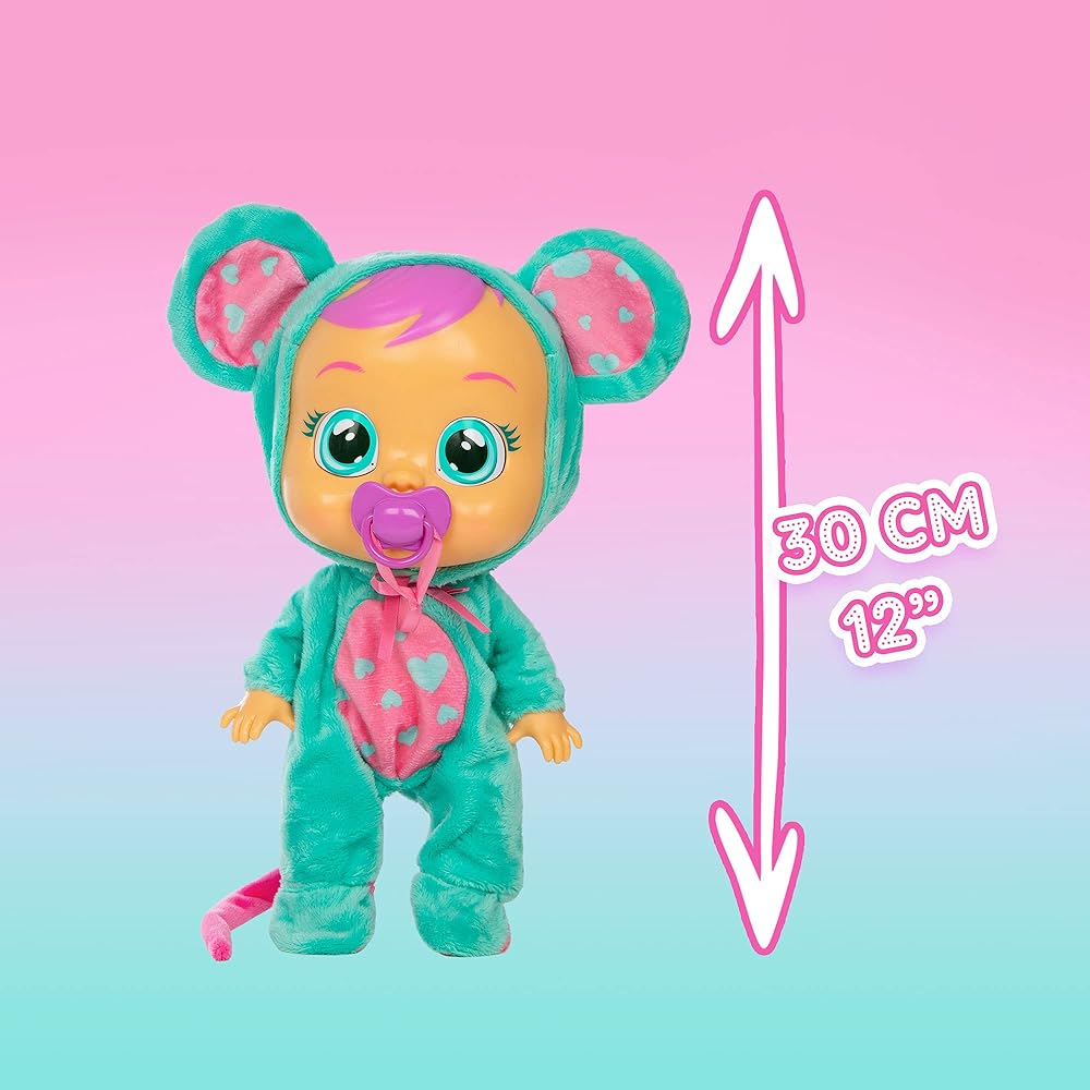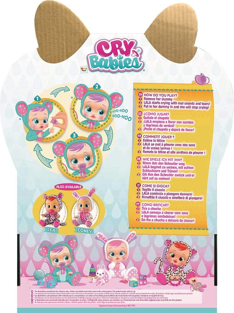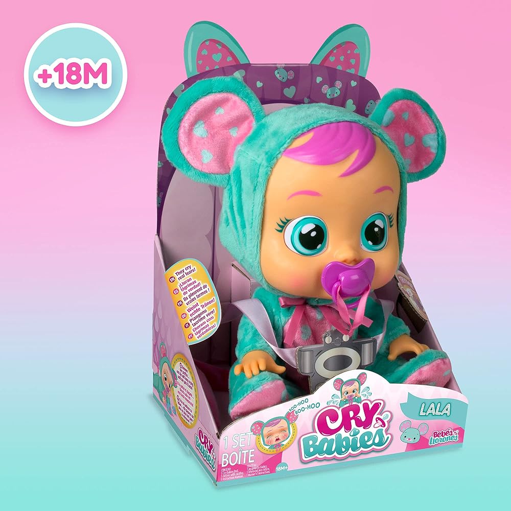 Meet Cry Baby Lala! Dressed in a changeable mouse themed onesie, she cries real tears and makes realistic baby sounds when you take away her pacifier! Give her lots of cuddles or gently lay her down to stop her from crying. Lola encourages kids to engage in fun imaginative play!