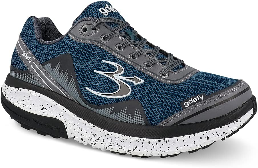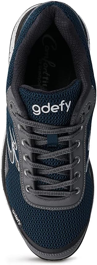 Gravity Defyer(r) Mighty Walk 스니커즈의 충격 흡수 지지대를 착용하면 모든 걸음이 간편합니다. VersoShock(r) 특허 기술은 발목, 무릎, 발 및 등의 통증을 완화하는 것으로 임상적으로 입증되었습니다. 넉넉한 앞심을 제공합니다. 앞면 로커 밑창. 패딩 처리된 칼라와 텅이 있는 전통적인 레이스업 클로저.
