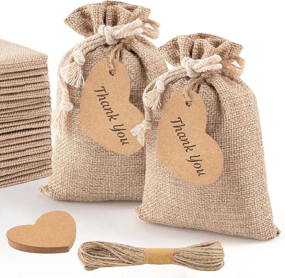 💕 EASY TO CUSTOMIZE. The burlap bags are good for craft and DIY projects as they are easily to customize. You can paint, stamp and stencil on them. The package also includes 20 pieces of matching craft paper gift tags and a roll of 10m string, adequate for you to use, great for crafting and decorating.