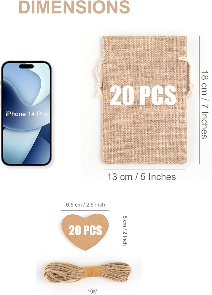 💕 20pcs 5 x 7" BURLAP GIFT BAGS. Each gift bag measures about 5 x 7" (13 x 18cm), gift tags size 2.5 x 2" (6.5 x 5cm), twine length 32ft/10m. Great for wrapping nice gifts or storing seeds, coffee beans, goodies, jewelry, toys, crafting and other small items.
