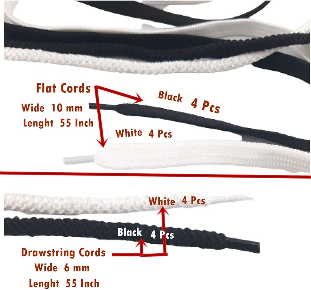 Flat Drawstring Replacement Cords 8 Pcss - Wide 10mm X 55 Inch Black, White for Hoodie, Sweatpants, Sweatshirt, Shorts, Pants Exercise, Jackets, Coats, Boots, Sneaker, Shoe Laces, Tote, Bags