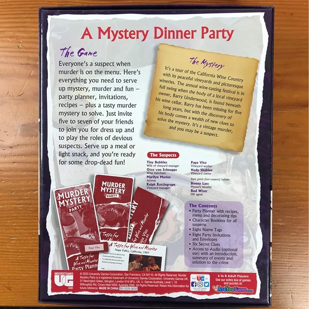 Everyone's a suspect when murder is on the menu. The aroma of home cooked pasta is drifting from New York City's most popular Italian eatery, but something else is heating up the kitchen as the Restauranteur has been shot. Family and friends will gather to pay their respects, but one of the guests won't be shedding any tears. This mystery dinner party game for adults includes recipes, a shopping list, invitations plus a tasty murder mystery to solve. Each player dresses up and plays the role of a suspect to the murder.