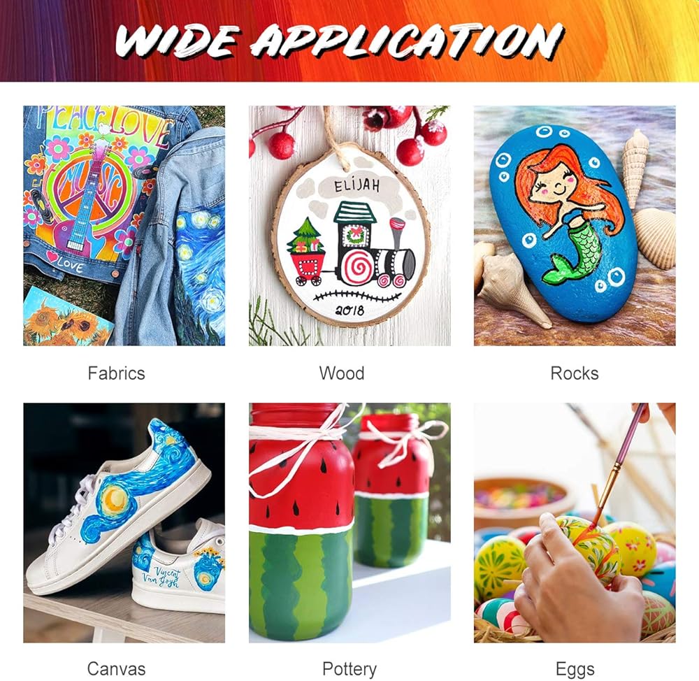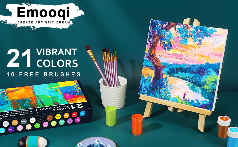 21 لونًا زاهيًا من الأكريليك: قوس قزح كامل مكون من 21 لونًا فريدًا ولافتًا للنظر تحت تصرفك، بما في ذلك 15 لونًا أساسيًا و6 ألوان معدنية. يمكنك لعب خيالك وموهبتك بحرية أكبر، وسوف تجلب لوحاتك إلى الحياة. 6 ألوان لامعة تجعل لوحاتك لامعة. الألوان نابضة بالحياة وغنية، امزج 21 لونًا لخلق مجموعة لا حصر لها من الألوان!