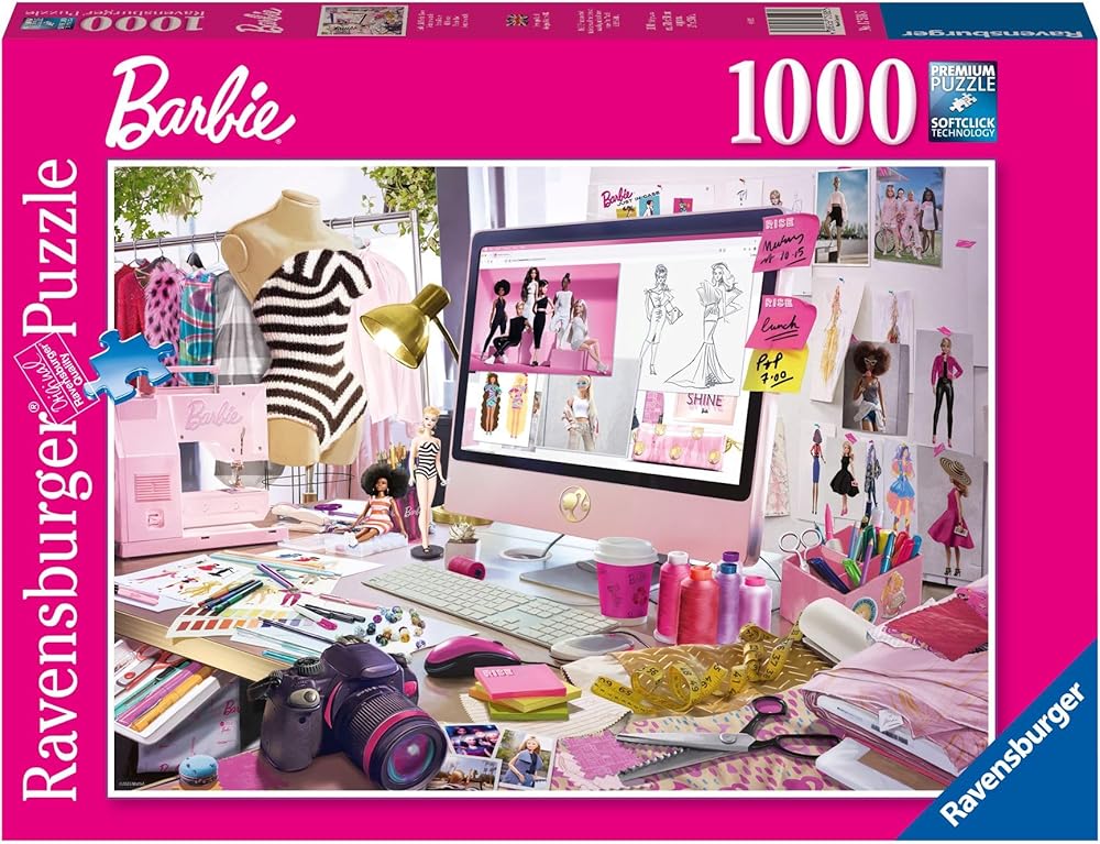 Barbie has always been a fashion icon, and this puzzle captures a day in the working life of a Barbie fashion designer. Working sketches and photographs fill the computer screen; these are ideas for future collections. The desk is littered with colour charts, fabric and thread samples, pens, scissors and more, as the designer gathers inspiration to turn their idea into reality. There's also a Barbie sewing machine, a Polaroid camera and some full size fashions, to ensure that everything created for Barbie follows the latest trends for the "real" world. This fabulously detailed puzzle is an ideal gift or pastime for Barbie fans everywhere and is a great way to unwind, relax and create some mindful moments