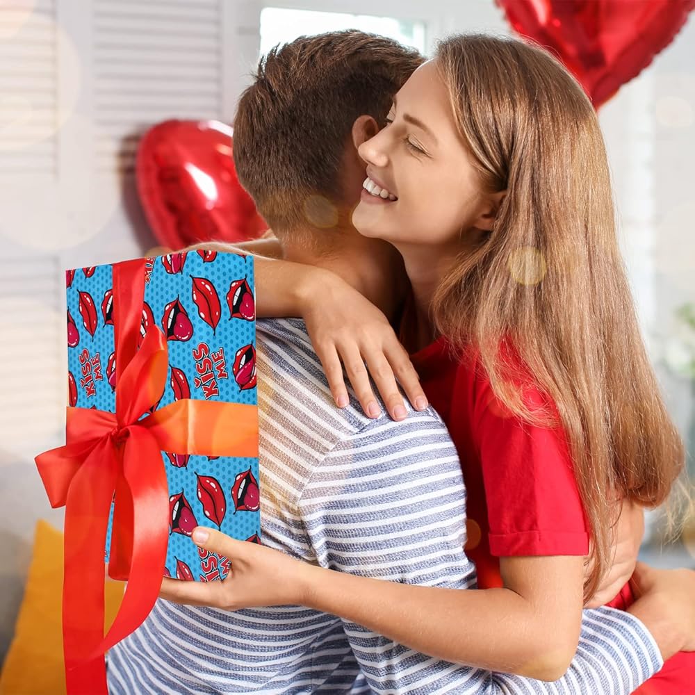 VALENTINES DAY DESIGN: This wrapping paper features reversible patterns of red lip KISS ME lettering on blue background and heart on the white side, make your gifts unique and romantic