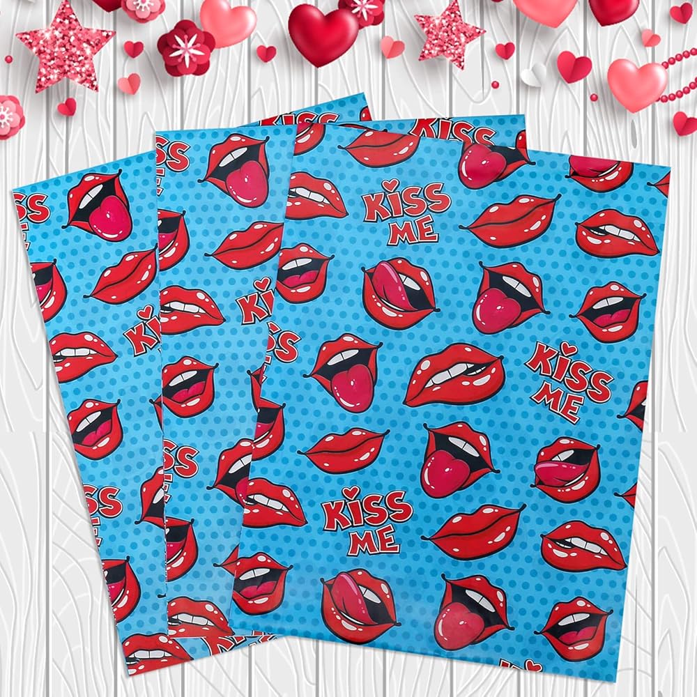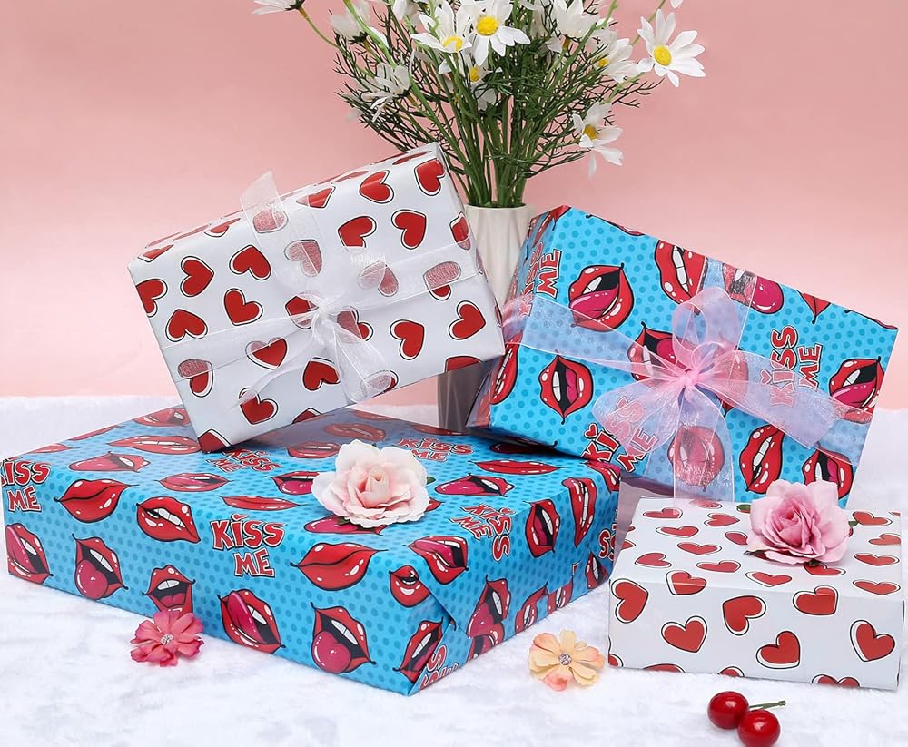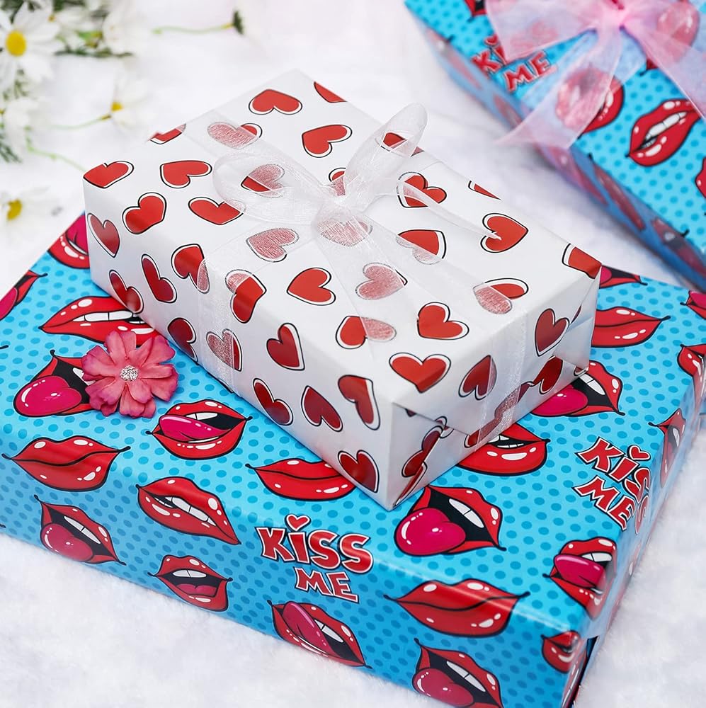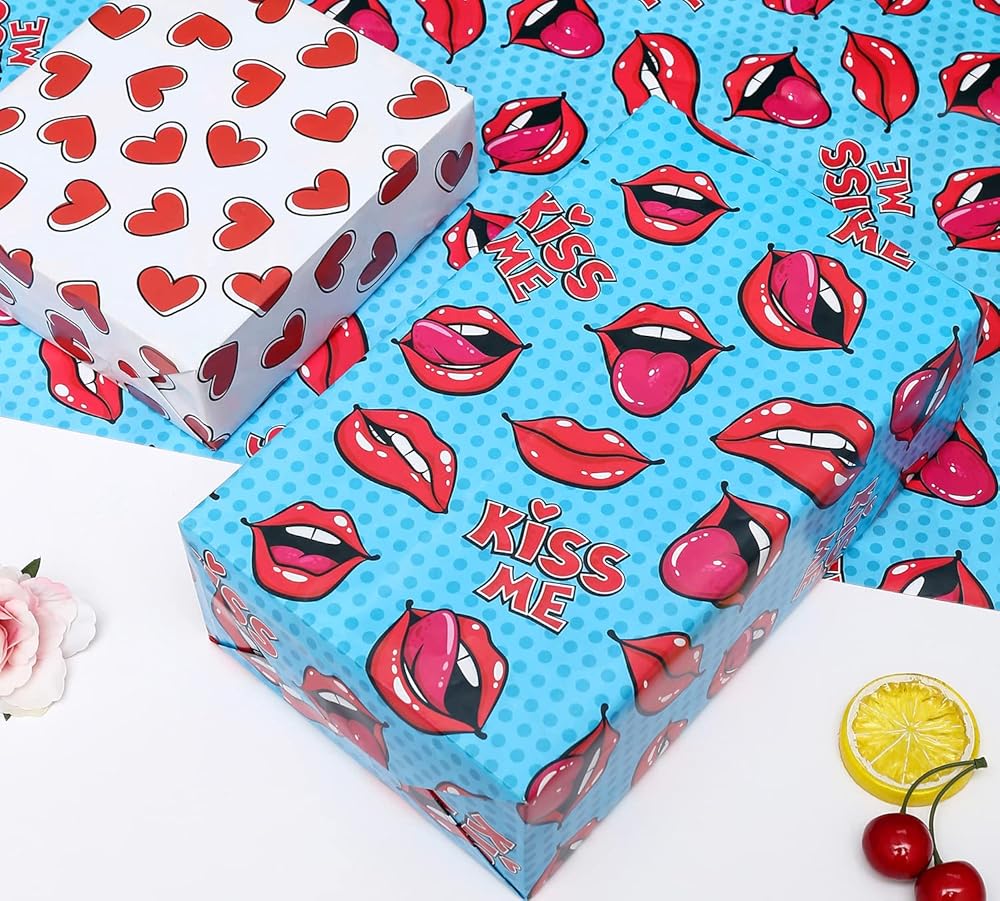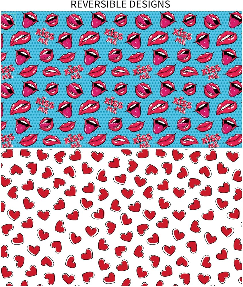 CAMKUZON Reversible Wrapping Paper for Valentine's Day, Birthday, Wedding, Holiday - 3 Large Sheets Red Lip with KISS ME and Heart Design Gift Wrap - 27 Inch X 39.4 Inch Per Sheet