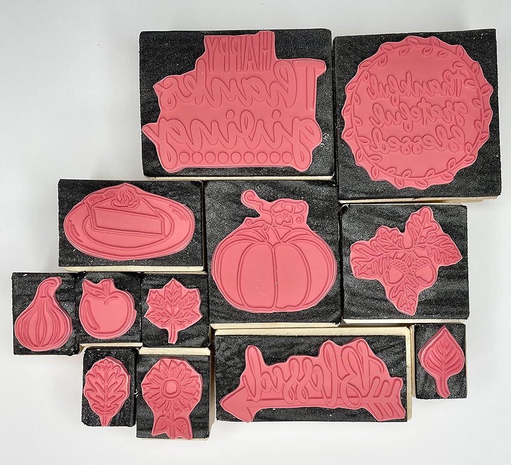 Thanksgiving themed rubber stamps on maple wood mounts. Set includes 12 different stamp images. Stamp sizes: Happy thanksgiving 2 1/2 x 2 inch, thankful grateful blessed 2x2 inches, acorns 1 1/2 x 1 1/2 inch, pumpkin 1 1/2 x 1 1/2 inch, blessed 2 1/2 x 1/2 inch, small oak leaf 1x 1/2 inch, small maple leaf 1/2 x 1/2 inch, pie 1 3/4 x 1 inch, gourd 1 x 1/2 inch, apple 3/4 x 3/4 inch, small aspen leaf 1 x 1/2 inch, sunflower 1 x 3/4 inch.