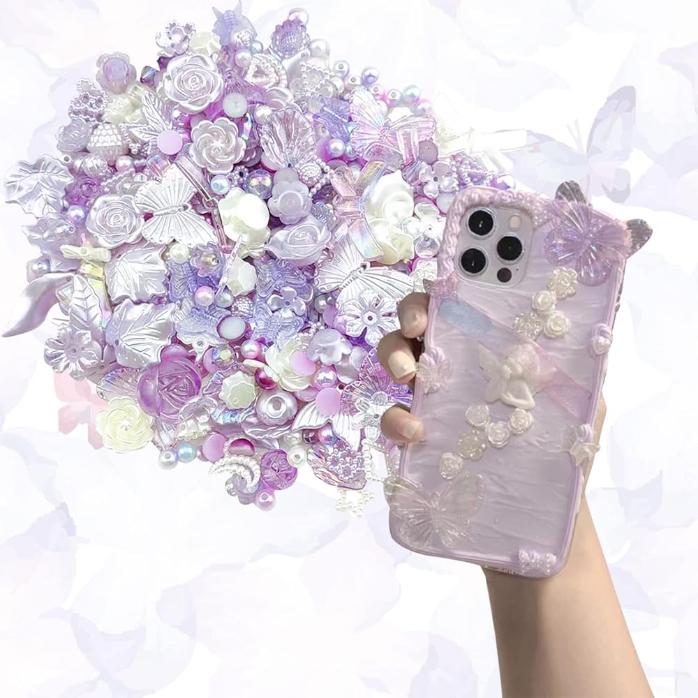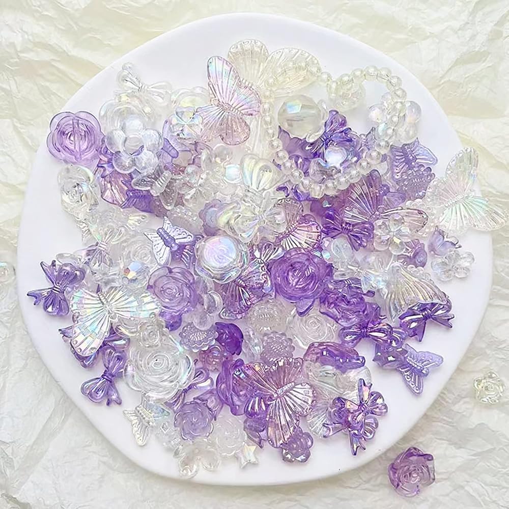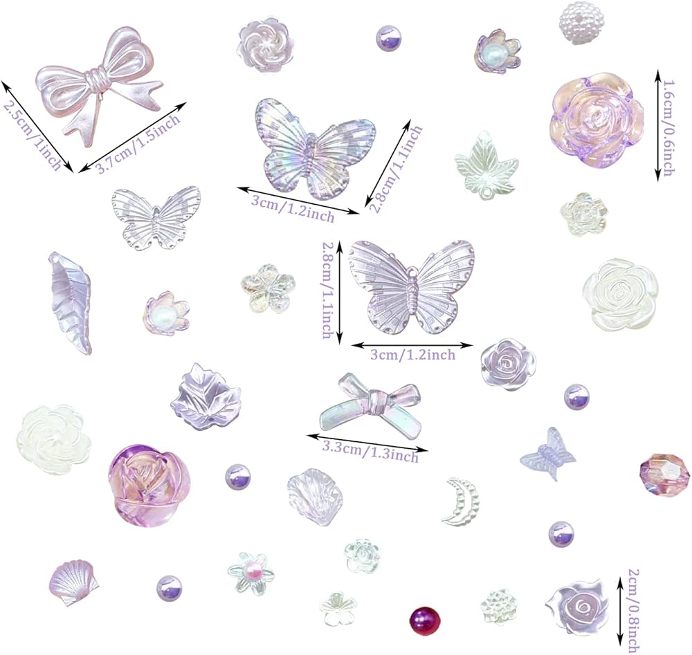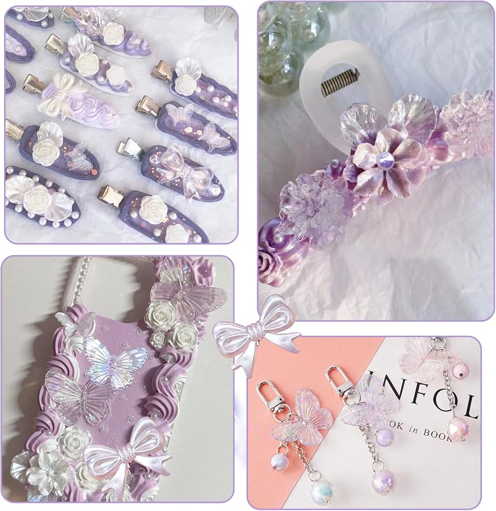 Kukiwhy 350 PCS 3D Resin ABS Colorful Rose Flower Bows Butterfly Charms with Flatback Half Round Pearl Beads for Bracelet Earring Necklace Craft DIY Making Supplies (Purple)