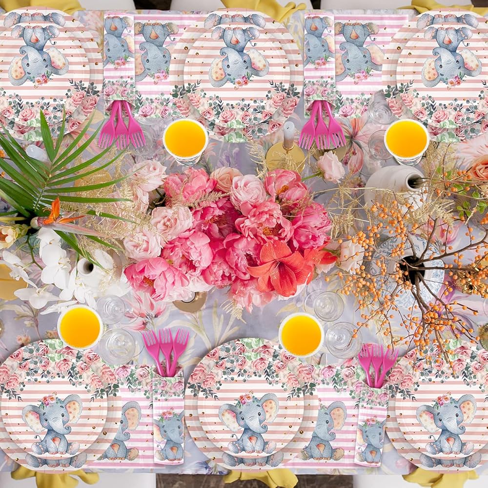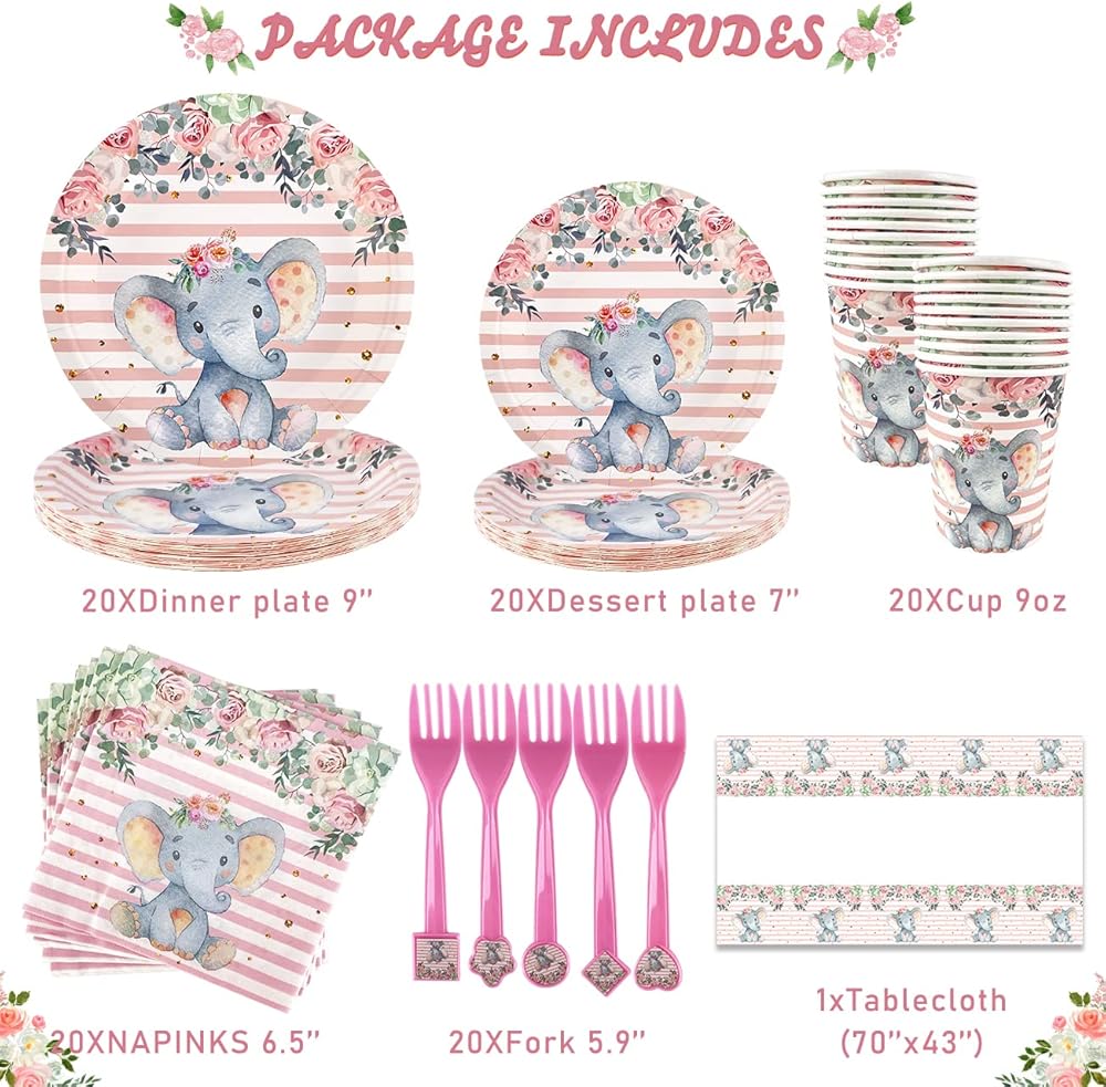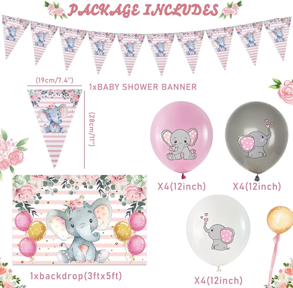 【Elephant Baby Shower Decorations Package Include】 The its a girl elephant baby shower decorations kit includes one pink elephant theme baby shower backdrop 36" × 60" and one tablecloth 70" × 43", 1*banner11*7.4", 4pcs pink elephant balloons 12" , 4pcs white elephant balloons 12" and 4pcs gray elephant balloons 12", 20*dinner plates 9", 20*dessert plates 7", 20*paper cups(9 oz), 20*napkins 6.5" and 20*fork 5.9" for 20 guests.