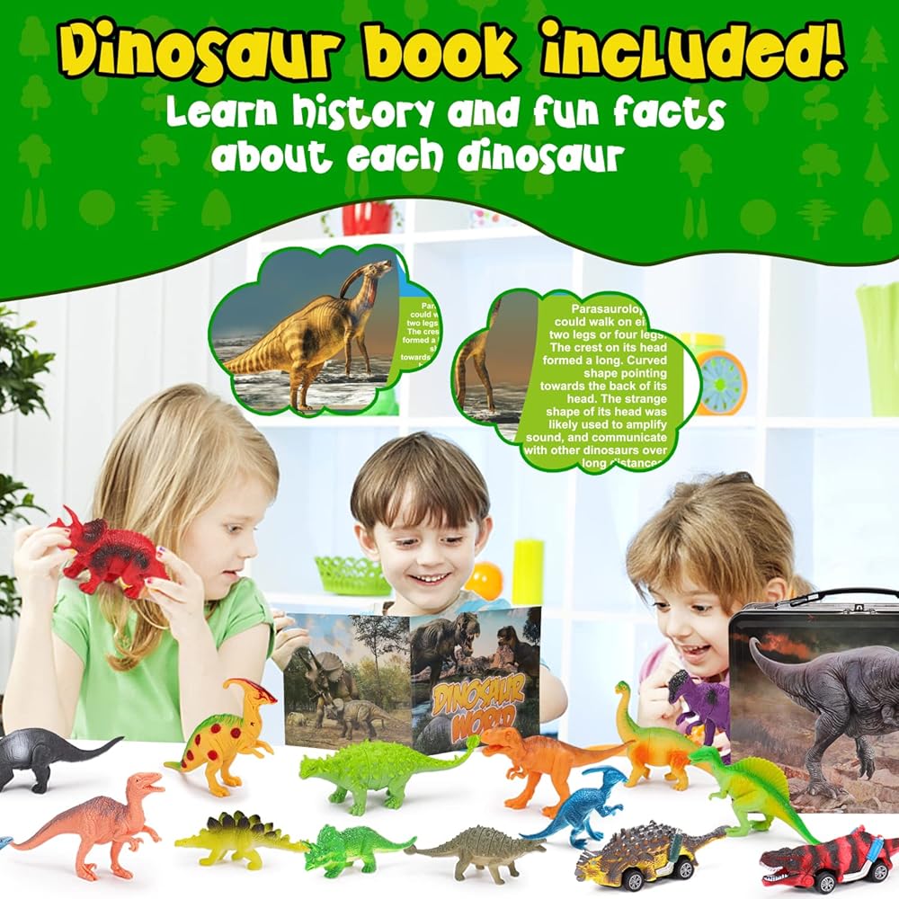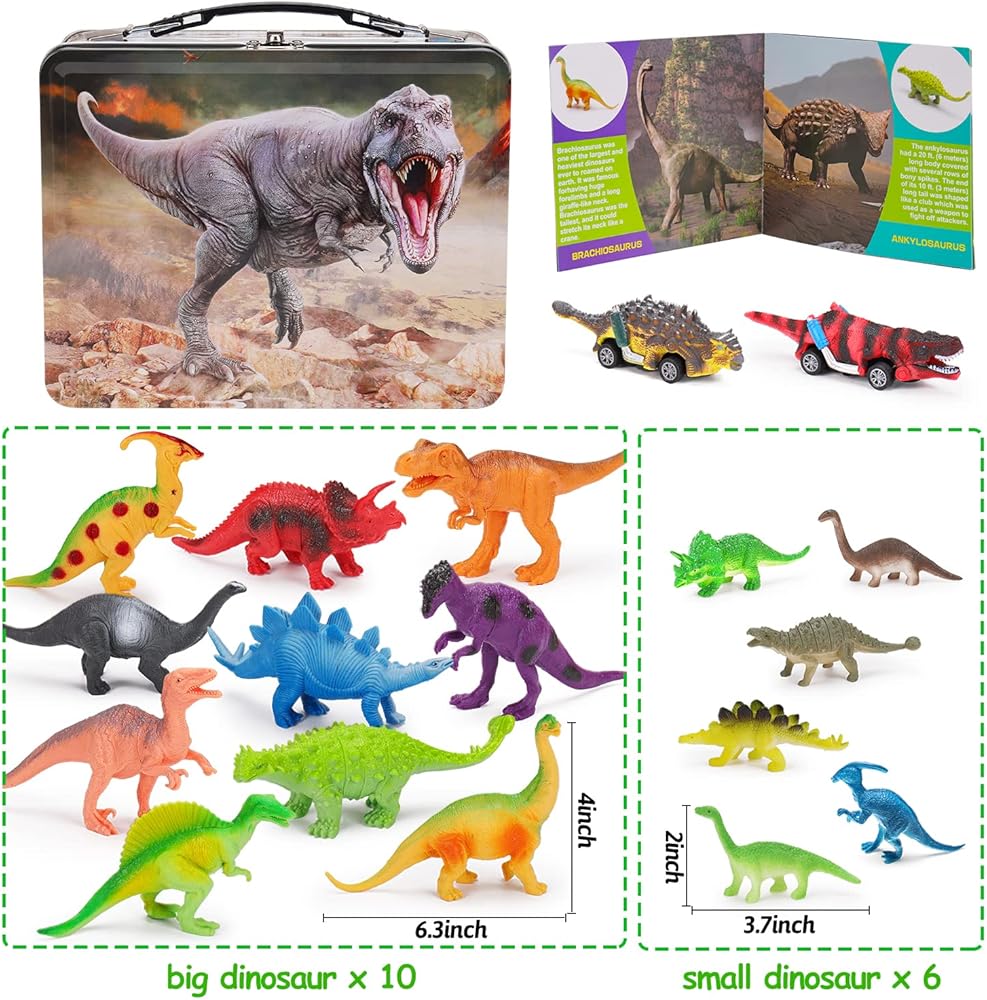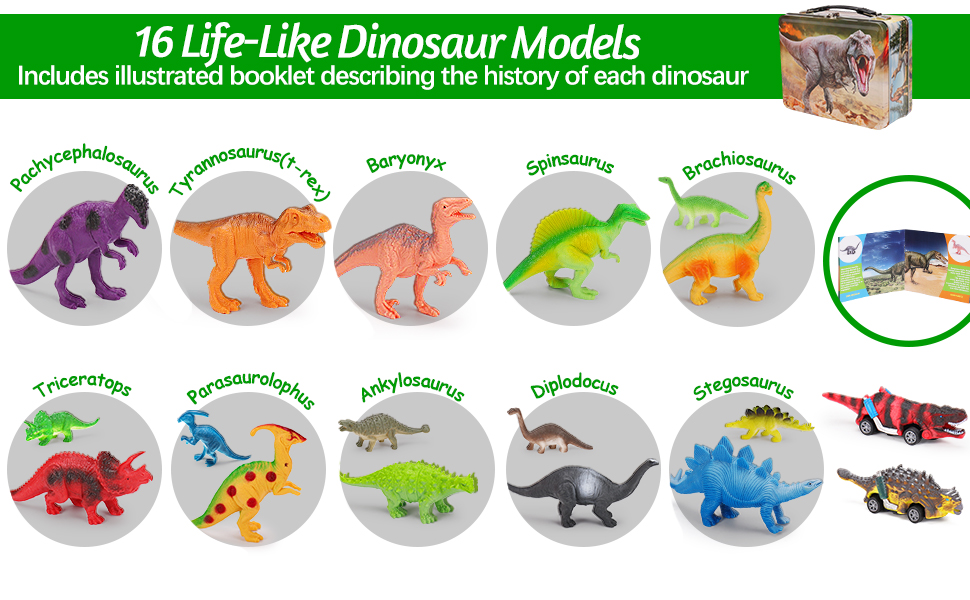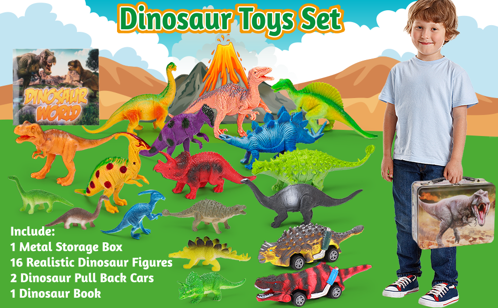 【Welcome to the Amazing Dinosaur World】 Our eye catching dinosaur toys set come with 1 mental storage box, 16 realistic dinosaur figures, 2 dinosaur pull back cars and 1dinosaur book in different colors and styles. When you open this exquisite mental storage box, you will see many kinds of highly realistic dinosaur toys, as if you came to the real world of dinosaurs. Super Value and Safe Package for endless fun!