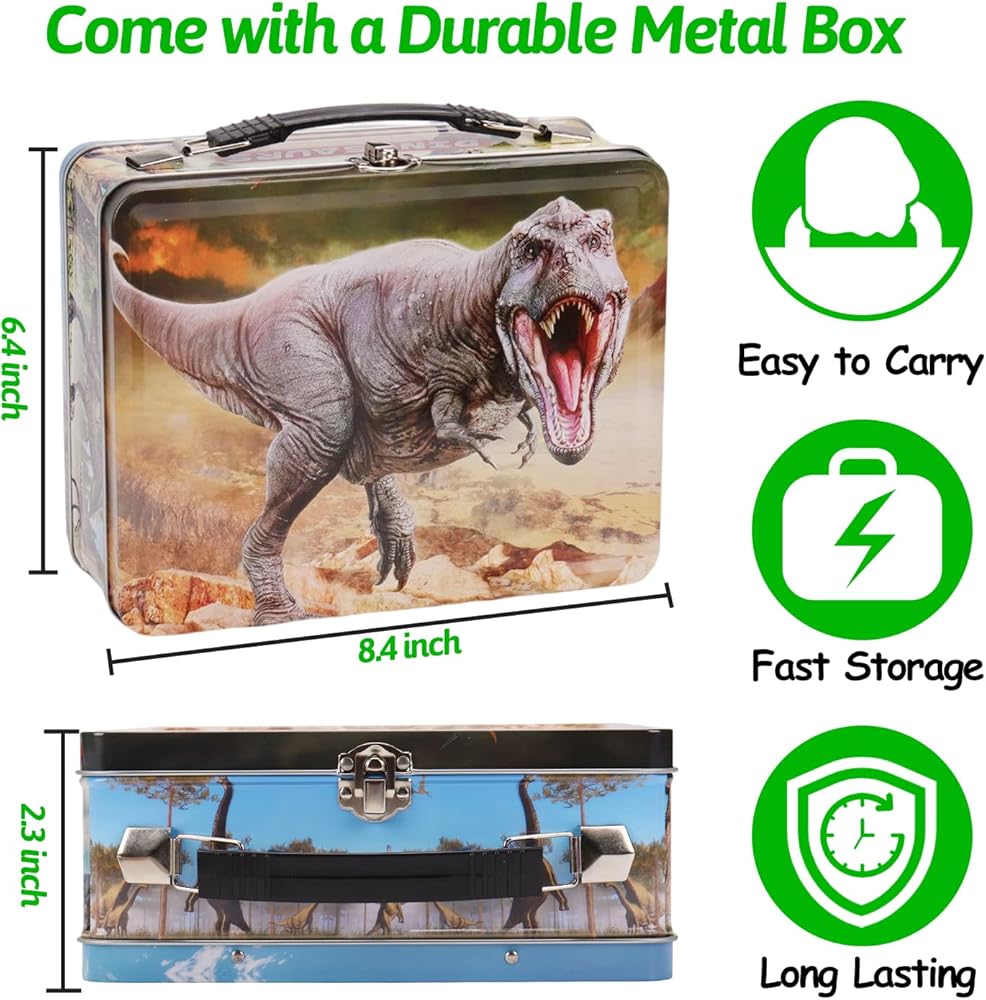 【Metal Storage Box】 Our non-toxic and tasteless metal storage box is durable metal with beautifully designed dinosaur images which makes playing more fun and easy cleanup that kids and moms like! Convenient for your daily use and storage. This portable box including charming Jurassic Dinosaurs is very handy to carry wherever you go as travel toys.