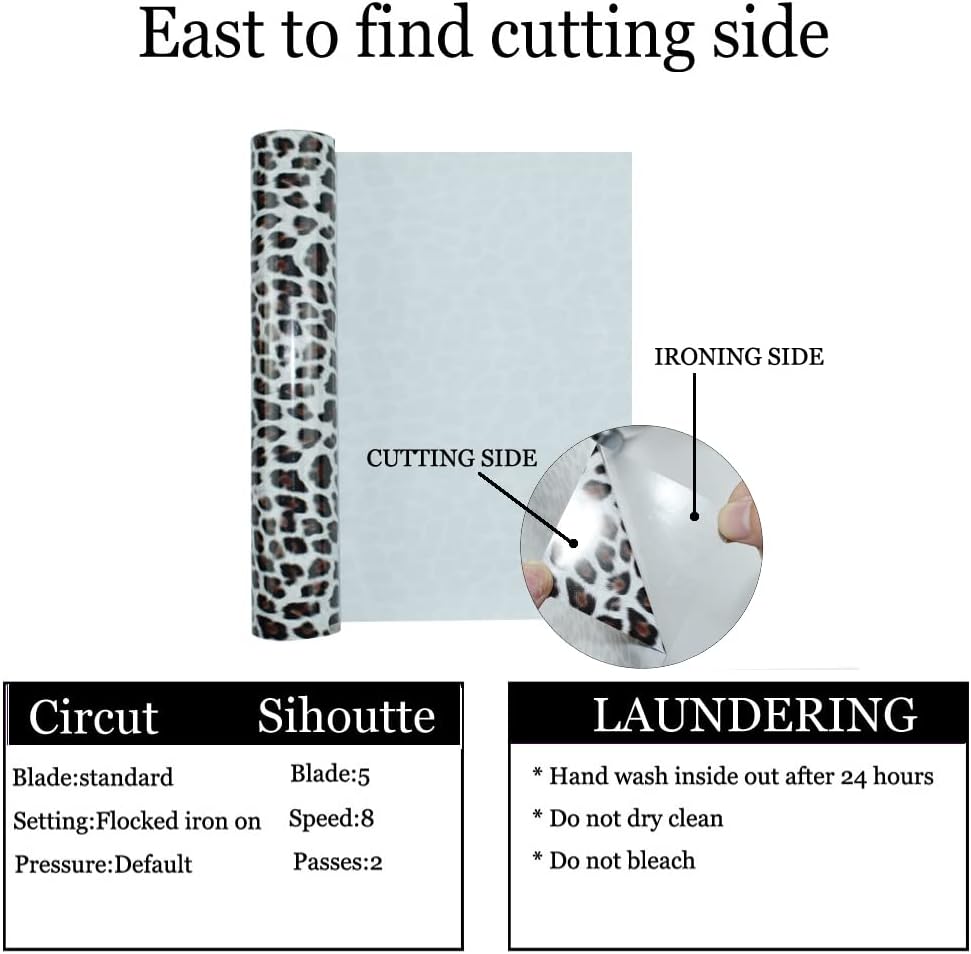 Great Stickiness : PABUES Leopard Print htv is pretty sticky, they adhere to the fabric seamlessly and has held up well in the wash without fading, peeling and crack.Home launder-ometer test: 40 degrees, more than 50 times,30 min/time. Your designs of our white heat transfer vinyl will keep the same color and can't come off even after repeated washing cycles.