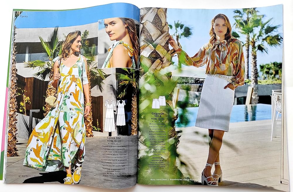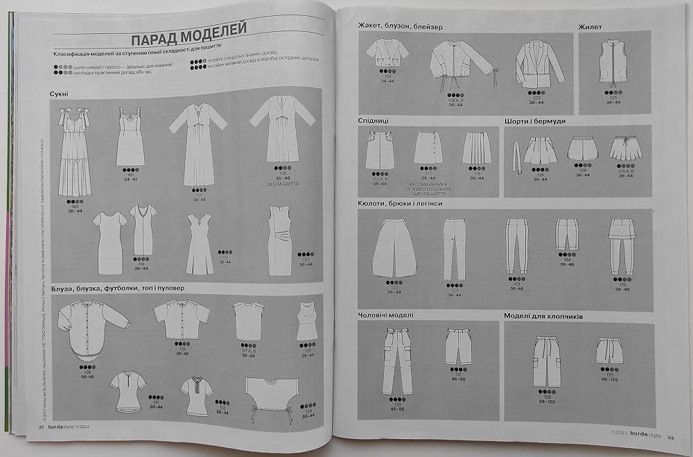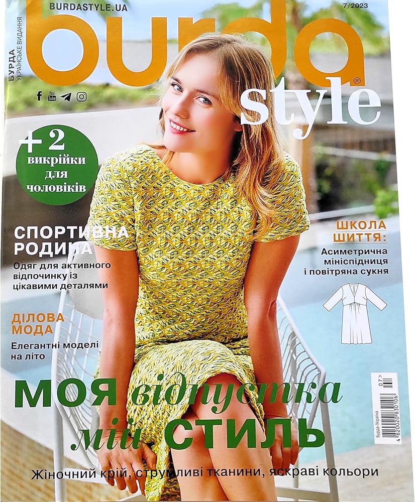 Vol. 7/2023 Burda Style Magazine in Ukrainian Sewing Patterns Templates Fashion Clothes Summer Dress Blouse Tops Skirt Pants Shorts Women Size 34-48 Men 46-56 Boys 98-122 Журнал Бурда Українською