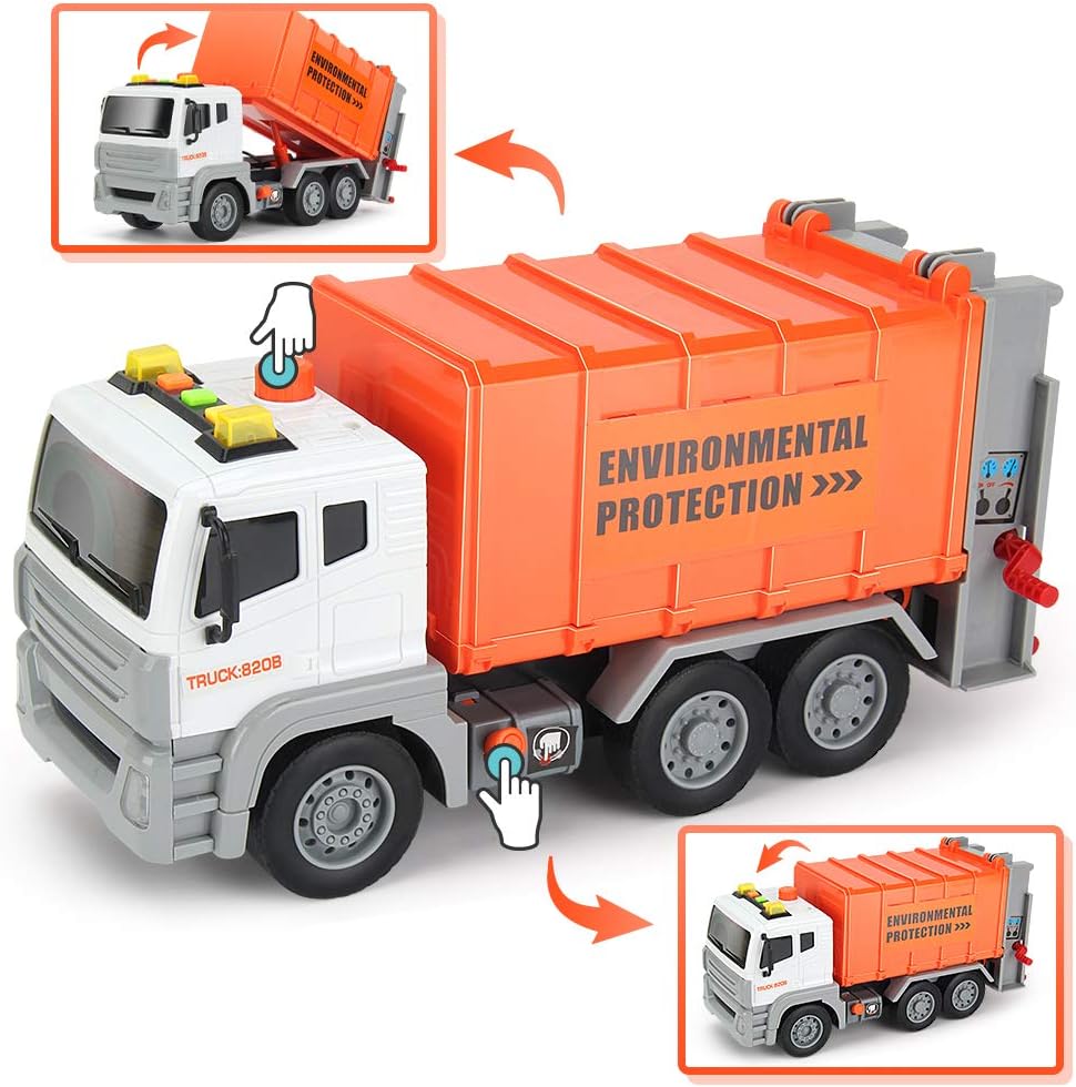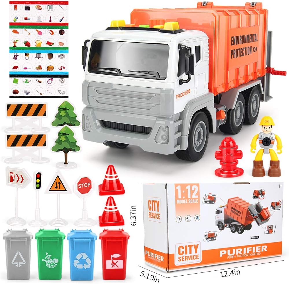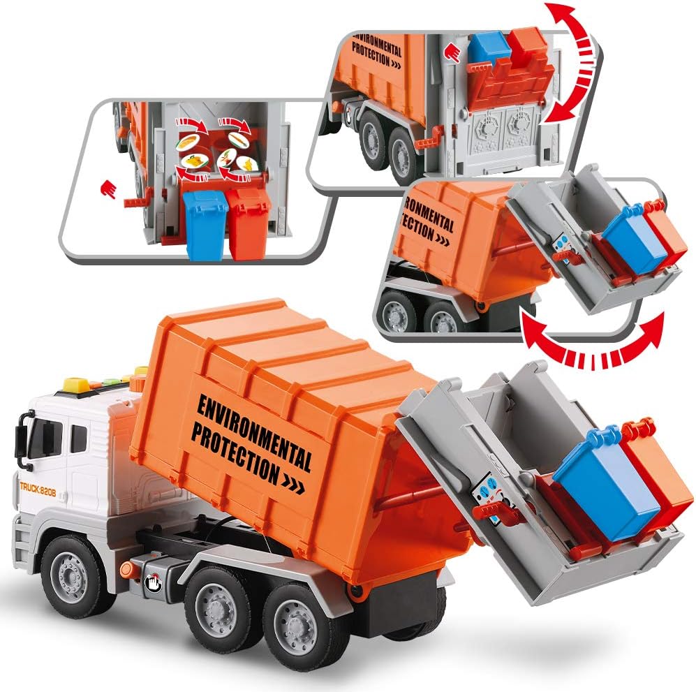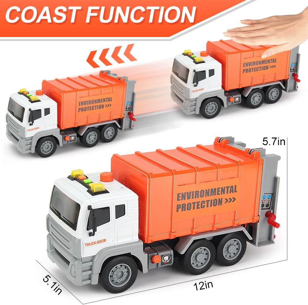 FRICTION POERED CAR & REALISTIC FUNCTIONS: The wheels of this toy truck is friction powered. Kids can push the truck to run to another place, then dump "waste" by lifting up the back of the truck.Push away the insulation of battery, then Press the button on the truck head to experience realistic sounds and lights, add more fun for kids to play.