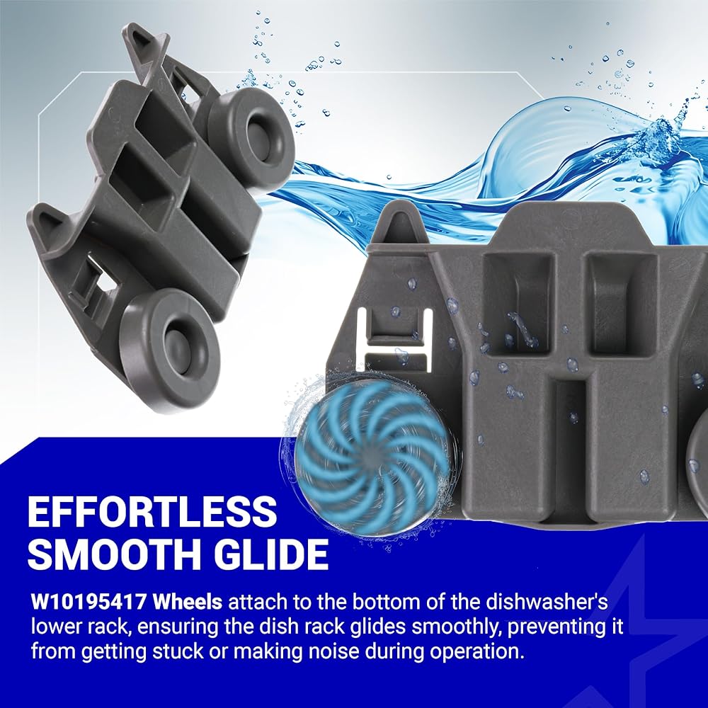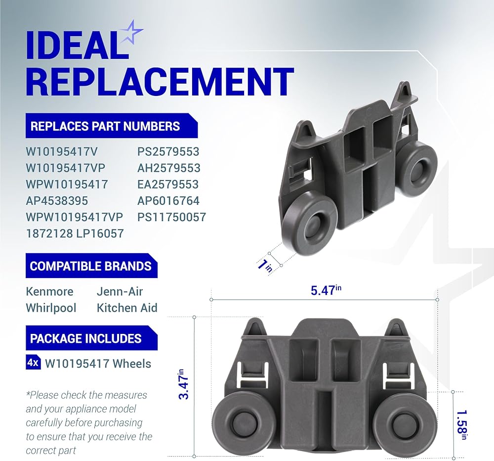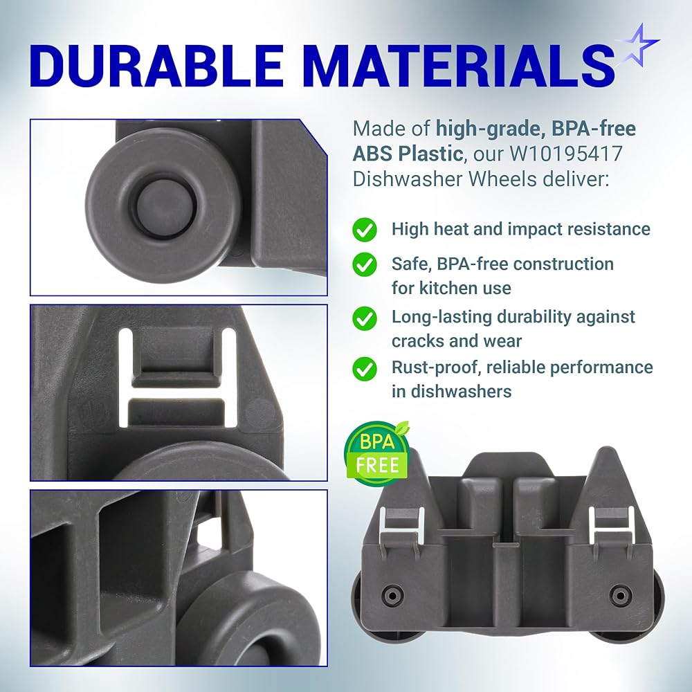 ✅ PERFECT PROPER FIT: The redesigned version was tested carefully by our development team to ensure it replaces perfectly the originals and meets OEM quality standards. The W10195417 Dishwasher Wheel replaces part numbers: WPW10195417, WPW10195417VP, AP4538395, PS11750057, AP6016764, PS2579553, EAP11750057, AH2579553, EA2579553.
