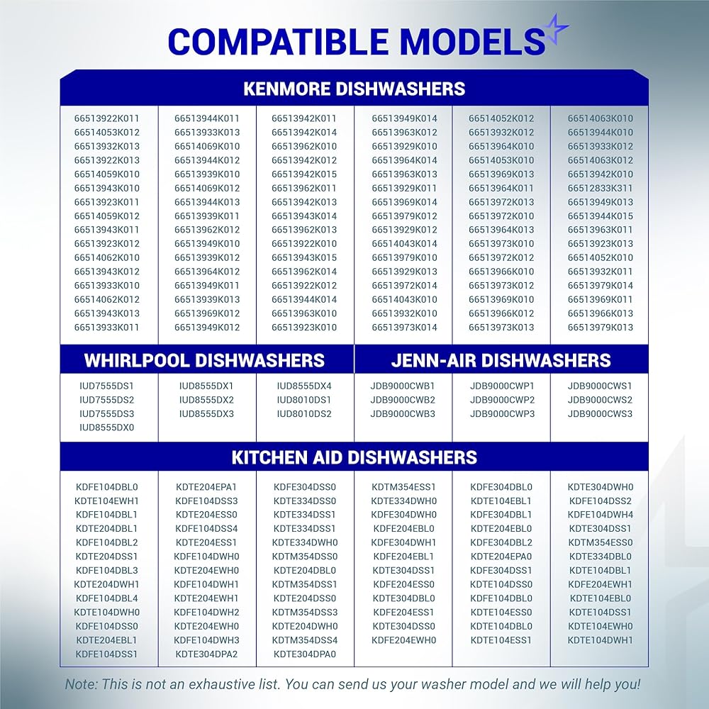 ✅ HIGH COMPATIBILITY: It is made exactly fit for most top name brands (KitchenAid, Kenmore, Whirlpool, Jenn-Air), fits models: [Kenmore] 665.12833K311, 665.13922K010, 665.13942K015, 665.13944K014, 665.13969K014, 66513922K011, etc. [KitchenAid] KDFE104DBL0, KDFE104DBL1, KDFE104DBL4, KDFE104DSS3, KDFE104DWH2, KDFE204ESS0, etc. [Whirlpool] KDTM354DSS5, IUD7555DS2, IUD8010DS2, IUD8555DX0, IUD8555DX3, etc. [Jenn-Air] JDB9000CWB1, JDB9000CWB3, JDB9000CWS1, JDB9000CWP2, JDB9000CWS3, etc.