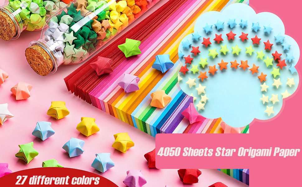 You will get: the package contains 4050 pcs star origami paper have 27 lovely colors, 150 pieces of each color, 4050 pieces in total, it can be folded into 4050 stars at most.These decorative origami paper are suitable for most DIY crafts.