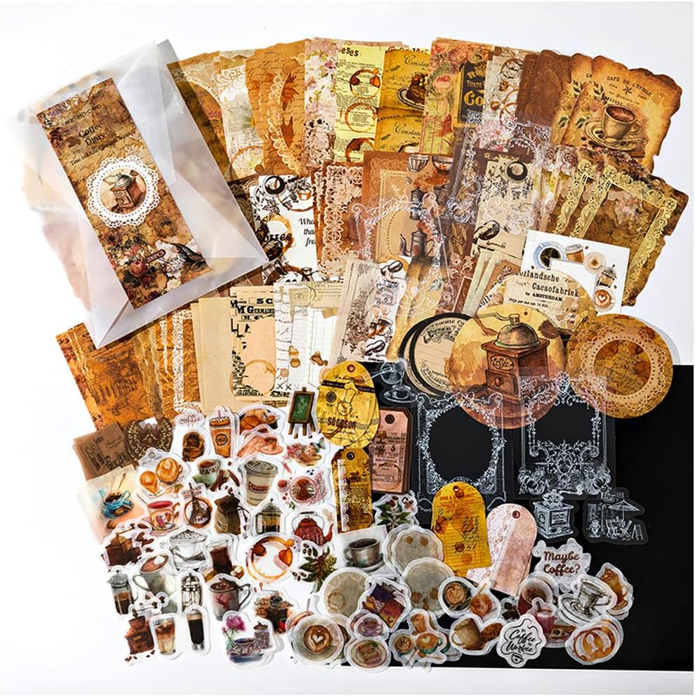 Vintage Scrapbook Accessories(200 Pieces), Vilikya Scrapbooking Supplies Kit for Adults, Aesthetic Stickers for Journaling, Bullet Journals, Collage Album (Coffee Diary)