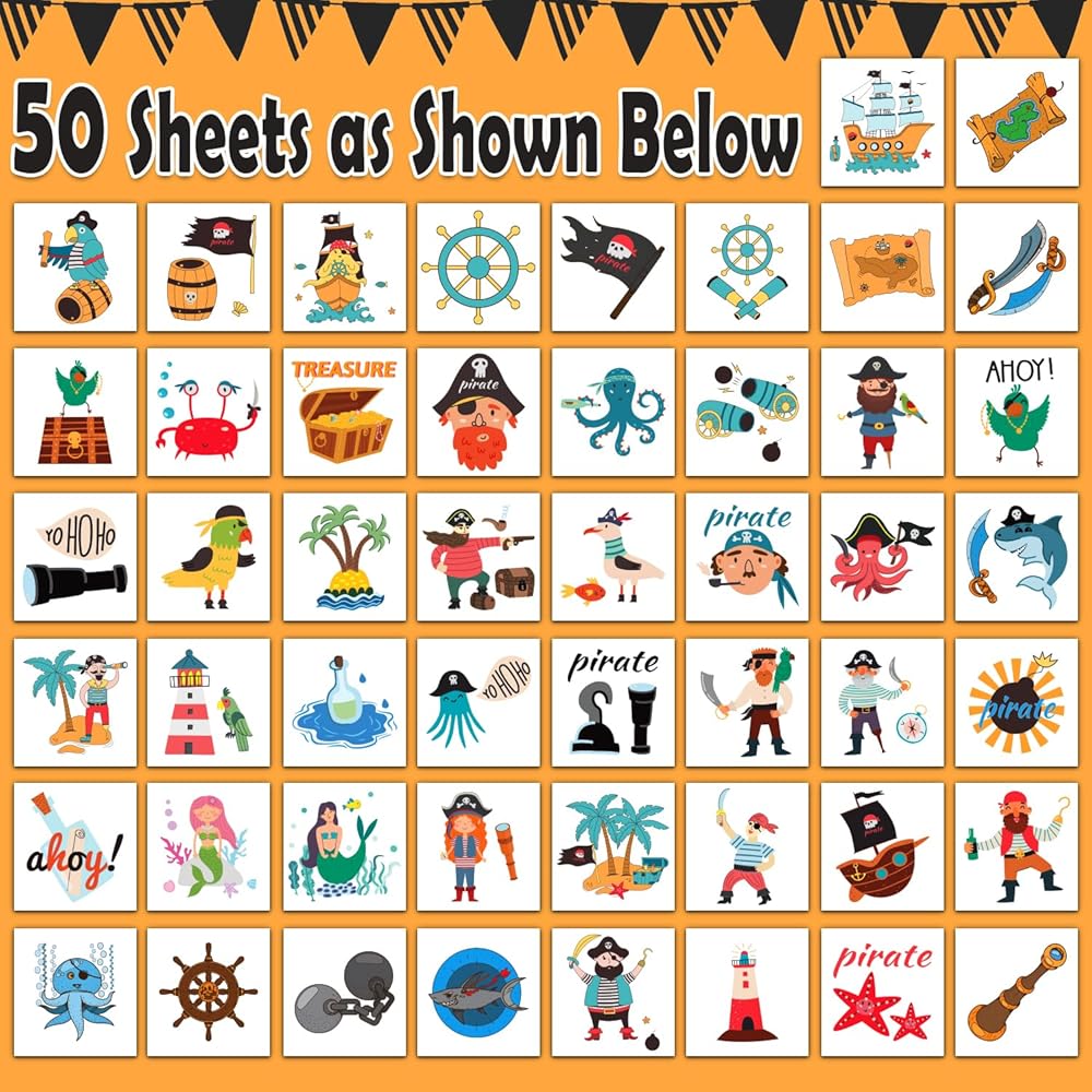 50 PCS (Individually Wrapped Sheets) Pirate tattoos stickers for kids boys girls.