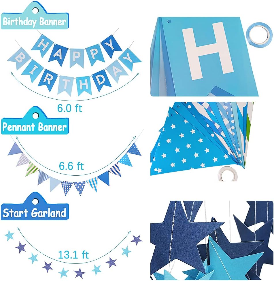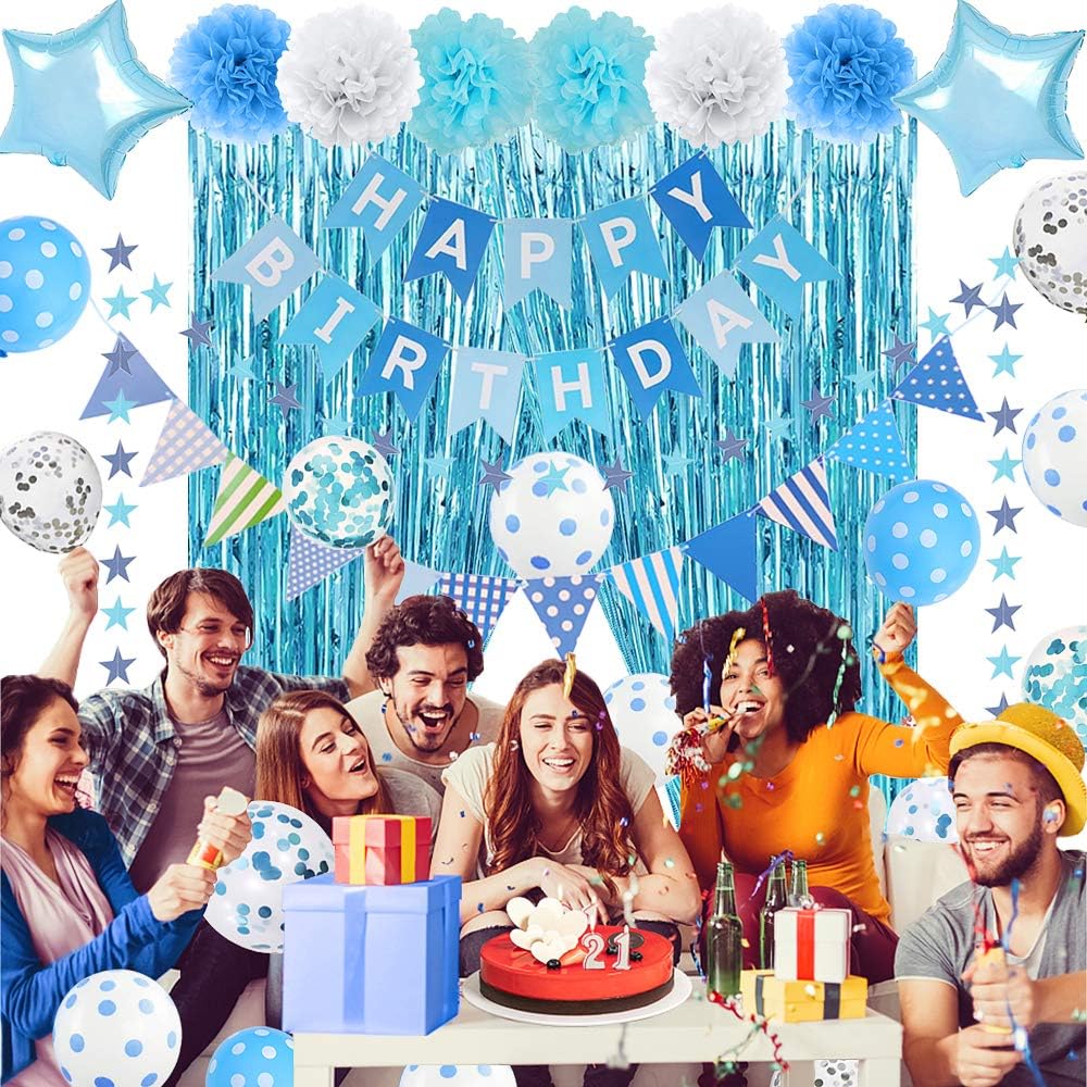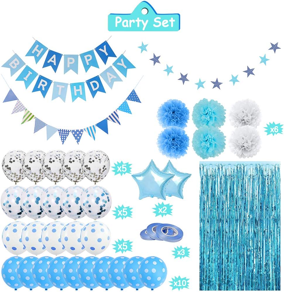 🎈 Birthday Party Decorations Set - We have put Happy Birthday Decorations Party Supplies you need together. 1 Pc Happy Birthday Banner, 1 Pc Triangular Pennants, 1 Pc Star Paper Garland, 1 Pc Fringe Curtains, 2 Pcs Light Blue Star Mylar Foil Balloons, 6 Pcs Paper Pom Poms, 10 Pcs Silver and Blue Confetti Balloons, 15 Pcs Blue Dot Balloons and 3 Pcs Sky Blue Balloon Ribbons.