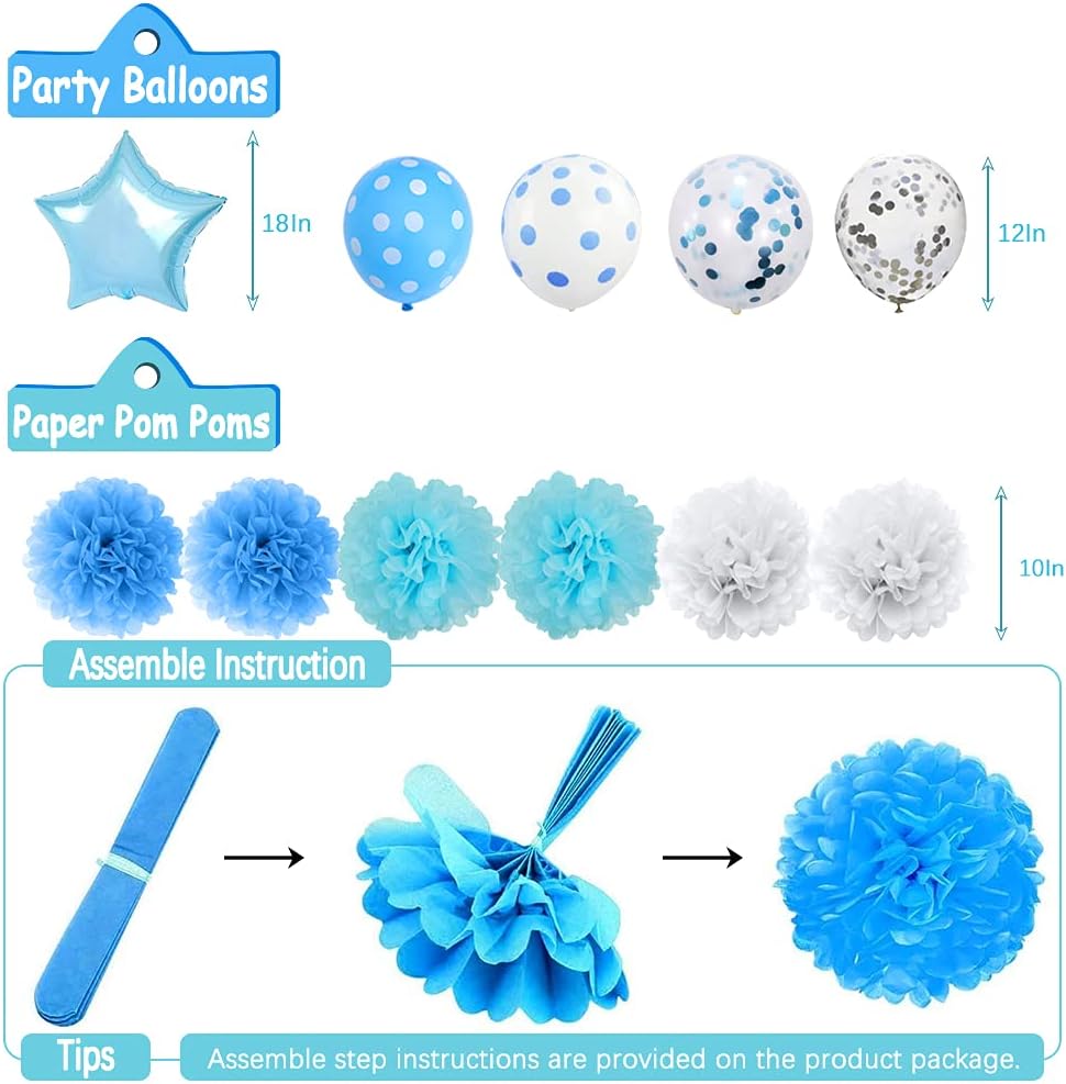 🎉 Easy to Assemble - The happy birthday banner, blue triangular pennants and tissue pom pom flowers needs to be assembled manually. They can be folded up for storage and used multiple times. A little bit of work, but a nice display. The balloons are made of quality latex material.