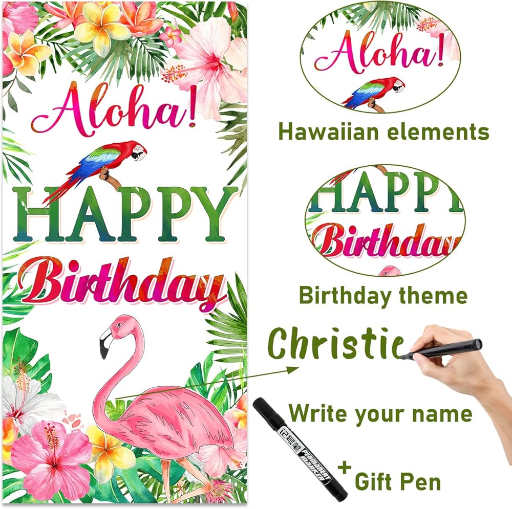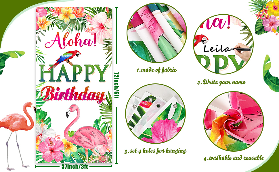 نبذة عن المقاس: مقاس خلفية الباب الأمامي من الوها هاواي المثالي هو 3 × 6 قدم، مع فتحات في الزوايا الأربعة لتمرير الحبال من خلالها، أو لصقها في المكان الذي تريد تزيينه لسهولة الاستخدام الداخلي أو الخارجي. كما أننا قدمنا قلمًا زيتيًا حيث يمكنك كتابة اسم بطل الرواية اليوم على الخلفية لإضافة المزيد من المرح إلى الحفلة.