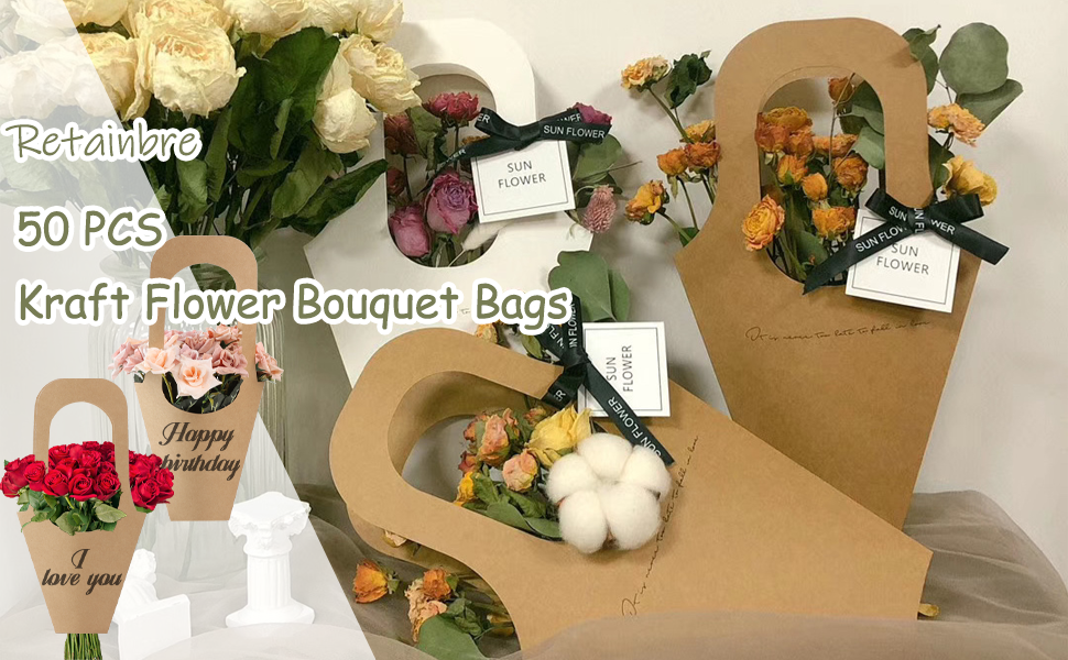 Retainbre 50 PCS Kraft Flower Bouquet Bags Brown Floral Wrapping Paper Bags Kraft Floral Gift Bags with Handle for Wedding Graduation Party Thanksgiving Christmas